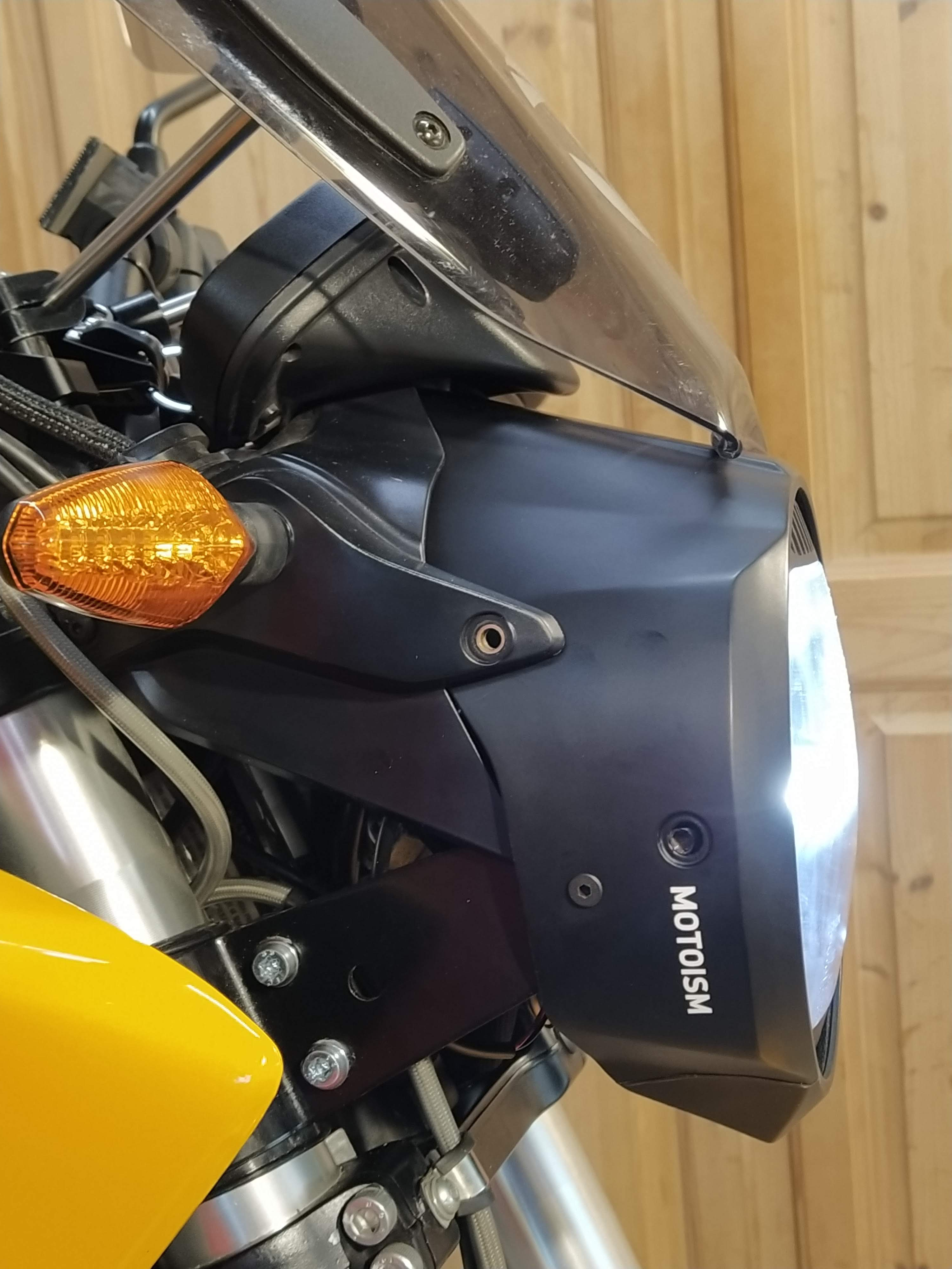 Bei der Motoism Maske hat es ein nicht brauchbares Montageblech zum Scheinwerfer, das hab ich demontiert und die Maske mit zwei Schrauben seitlich an den Lampenhalter montiert. Beim Scheinwerferumbau hab ich die Maske wo die Blinker montiert sind belassen, um die Möglichkeit zu haben den Original Scheinwerfer rückzubauen.