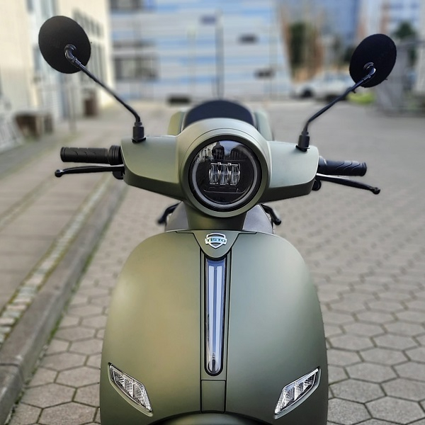Die Spiegel. Die Super Soco hatte einen sehr breiten Lenker. Der Roller jetzt einen deutlich schmaleren.