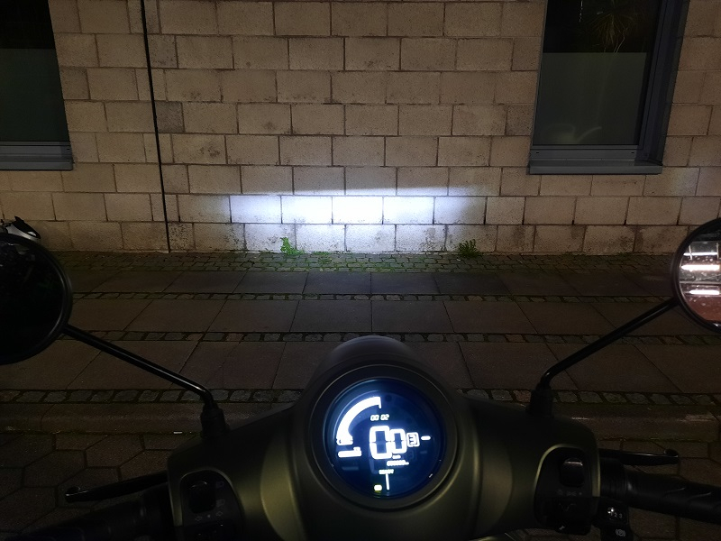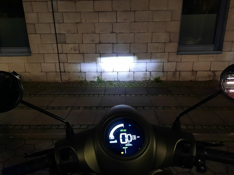 Das Abblendlicht ist nicht sehr weit nach links und rechts, aber vielleicht ist das bei Zweirädern durch die Kurvenneigung auch gut, damit man den Gegenverkehr nicht so blenden kann.