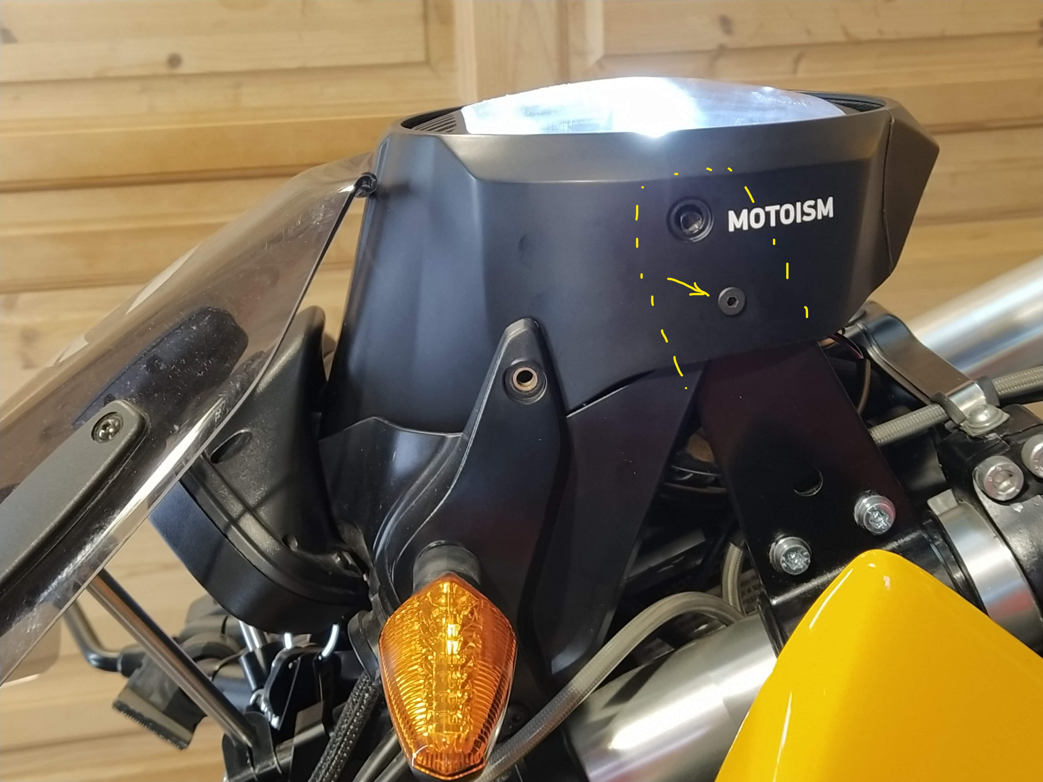 Für die Einpassung der Maske hab ich etwas länger gebraucht. Ein Abend nur bis ich entschieden habe dass der Montagerahmen, der mit der Maske kommt, nicht brauchbar ist. Ich hab die Maske dann einfach mit zwei Schrauben seitlich (siehe zweites Foto) an den Lampenhalter geschraubt. Den Lampenhalter darunter hab ich strichliert eingezeichnet.