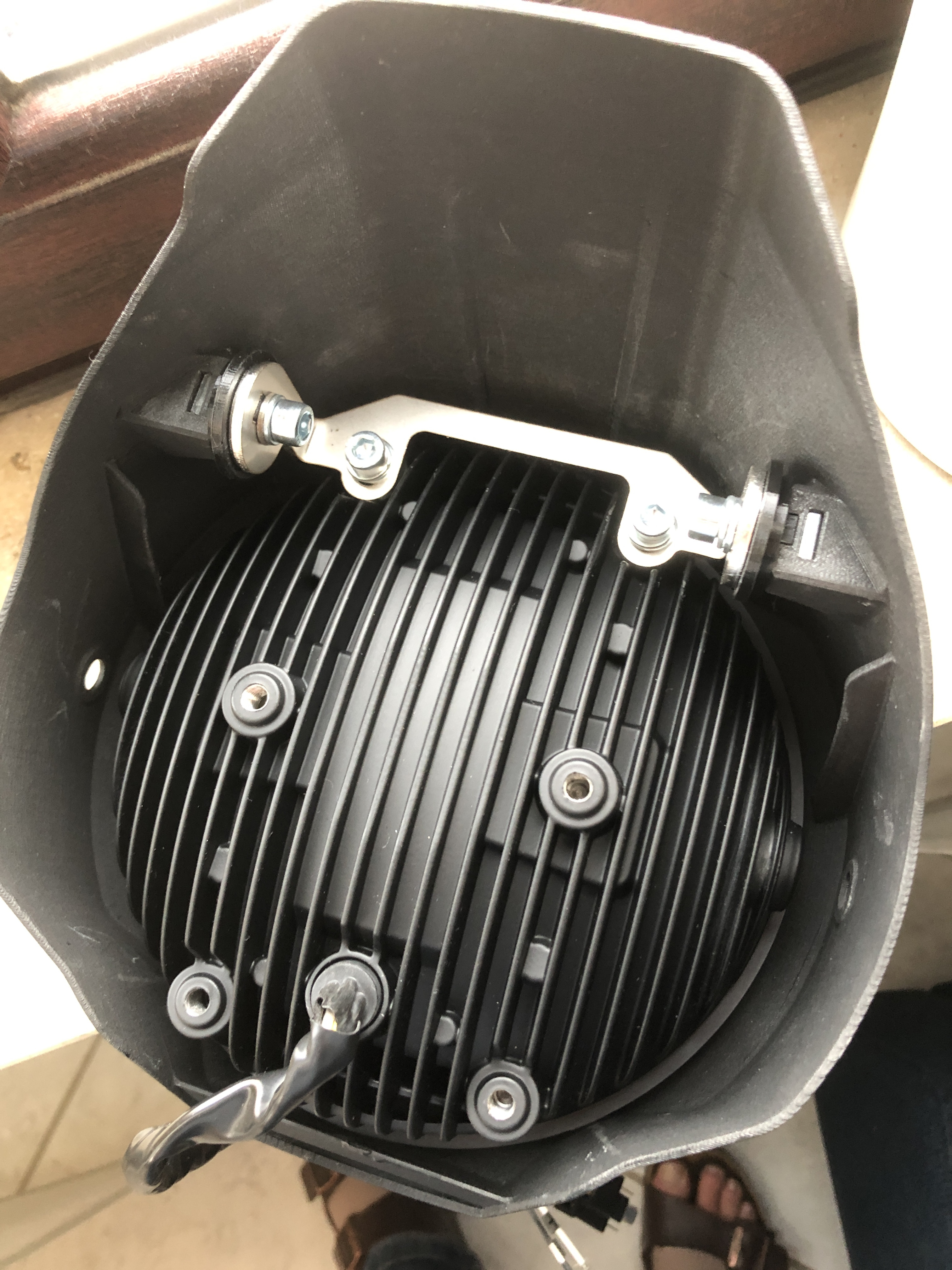 Du hast dem Blechhalter aber die Befestigung der Maske am Motorrad zugeordnet? Wie im Bild zu sehen kann es eigentlich nur so gemeint gewesen sein (Maske an Scheinwerfer), aber eine wirklich unabhängige Verdrehung von Maske und Schweinwerfer erkenne ich in der Konstruktion wahrlich nicht. Der Scheinwerfer muss direkt am Halter angeschraubt und eingestellt sein, während die Maske am Scheinwerfer befestigt ist, man aber an die Schrauben nimmer hinkommt, wenn der Scheinwerfer eingestellt und befestigt ist. In diesem Sinne also durchaus eine Fehlkonstruktion, so dass nur Deine separate Bohrung in der Maske wirklich Sinn macht...