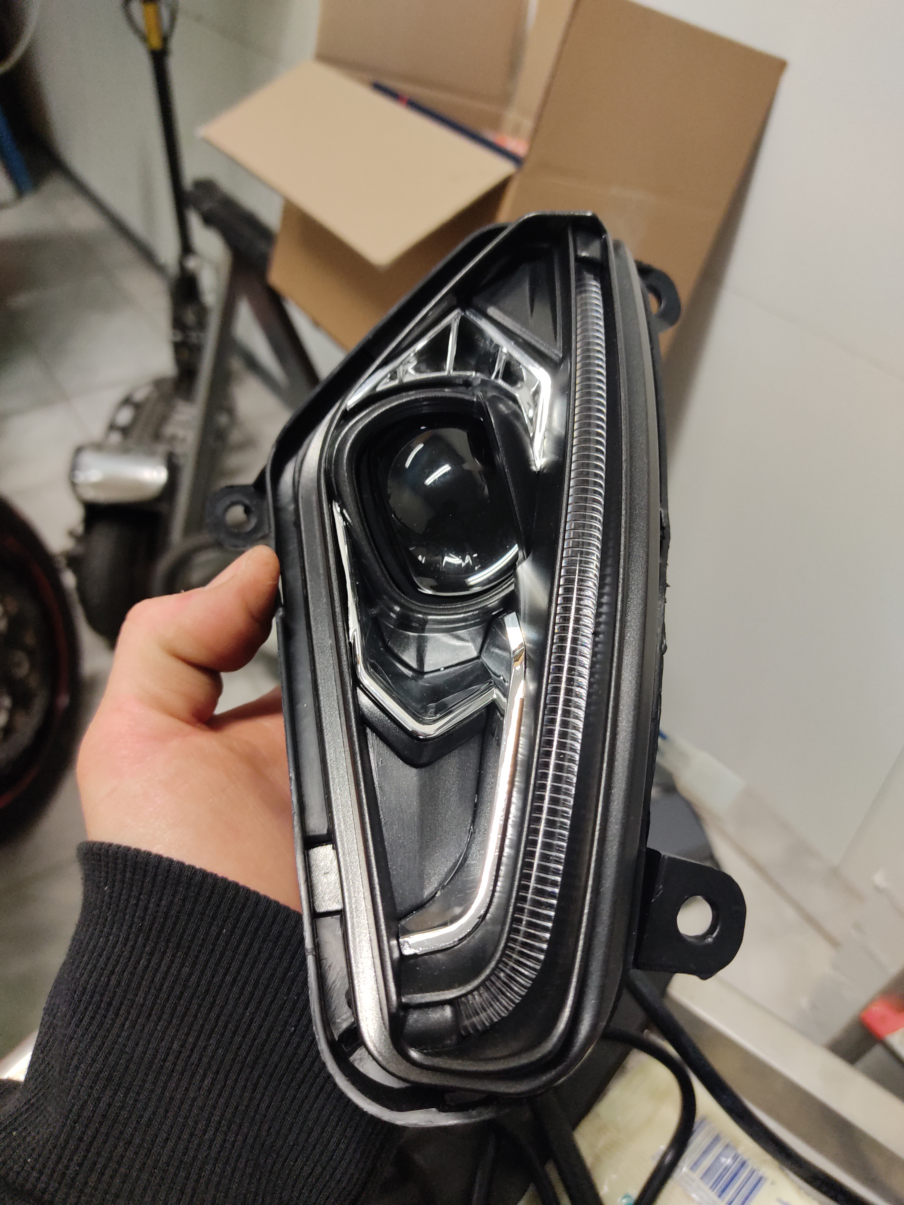 So ich habe das Ding mal gestrippt und wieder zusammen gebaut.... Ein paar impressionen Blinkgeber, Dc-Dc Wandler und auch gleich noch den Fernlicht mod erledigt d.h wenn Fernlicht dann brennen beide funzeln. Zum Thema Fernlicht man muss nur das weiße Kabel auspinnen und es mit dem brauen verbinden. Das kann auch wieder rückgängig gemacht werden. Wenn die LED mal durchgebrannt ist wird es für Otto-Normalo doof. Einmal neu bitte bzw. Jemand finden der löten kann. Unverständlich wie sowas eine Zulassung bekommen kann.