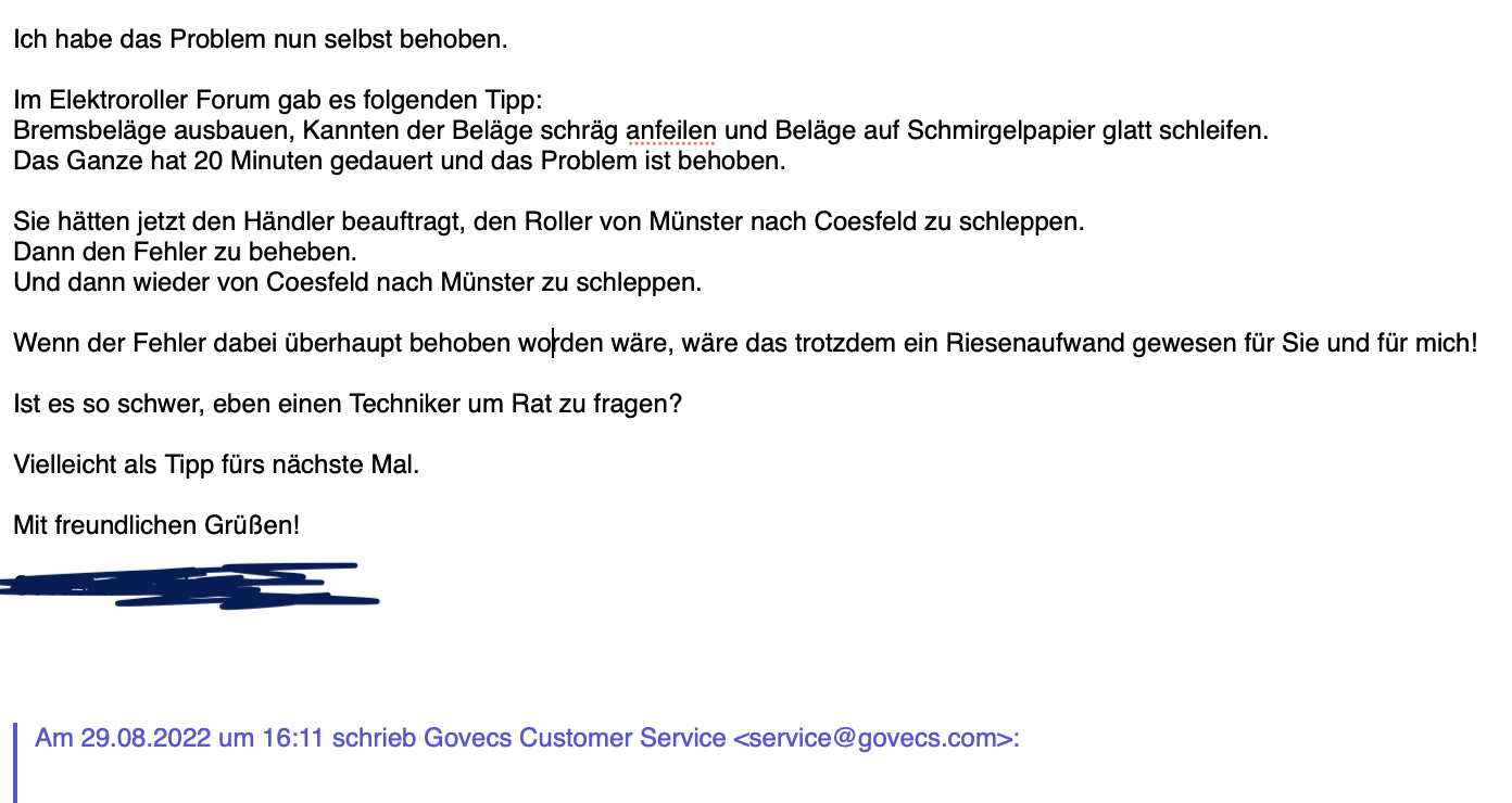 Dieses Produkt ist eine Schande für den europäischen Fahrzeugbau. Der Kundendienst schlichtweg eine Ansammlung von ungeschulten Billigkräften die dir irgendwas vom Pferd erklären. Die Chinesen werden diesen Markt übernehmen. Ich kaufe mit Sicherheit nie wieder was von Govecs.