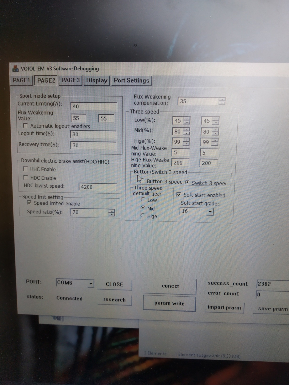 der MQCON/Sabvoton SVMC72150 war bei mir in kurzer Zeit eingerichtet und hatte lediglich die falsche Drehorientierung, die sich auch dort umschalten ließ. Da ist nicht viel einzustellen und er misst sich selber ein. Die Erkenntnisse dort haben aber meinen Ehrgeiz geweckt und mich zum VOTOL zurück gebracht und jetzt bremst dieser endlich auch mit Wenn der VOTOL weiter so laufen würde, könnte man mit der Software auch mehr machen. Dummerweise haben wir wohl genau die Charge erwischt, die nicht dauerhaft läuft und einzelne Programmierwerte nicht annimmt/verliert und man testet sich den Wolf.