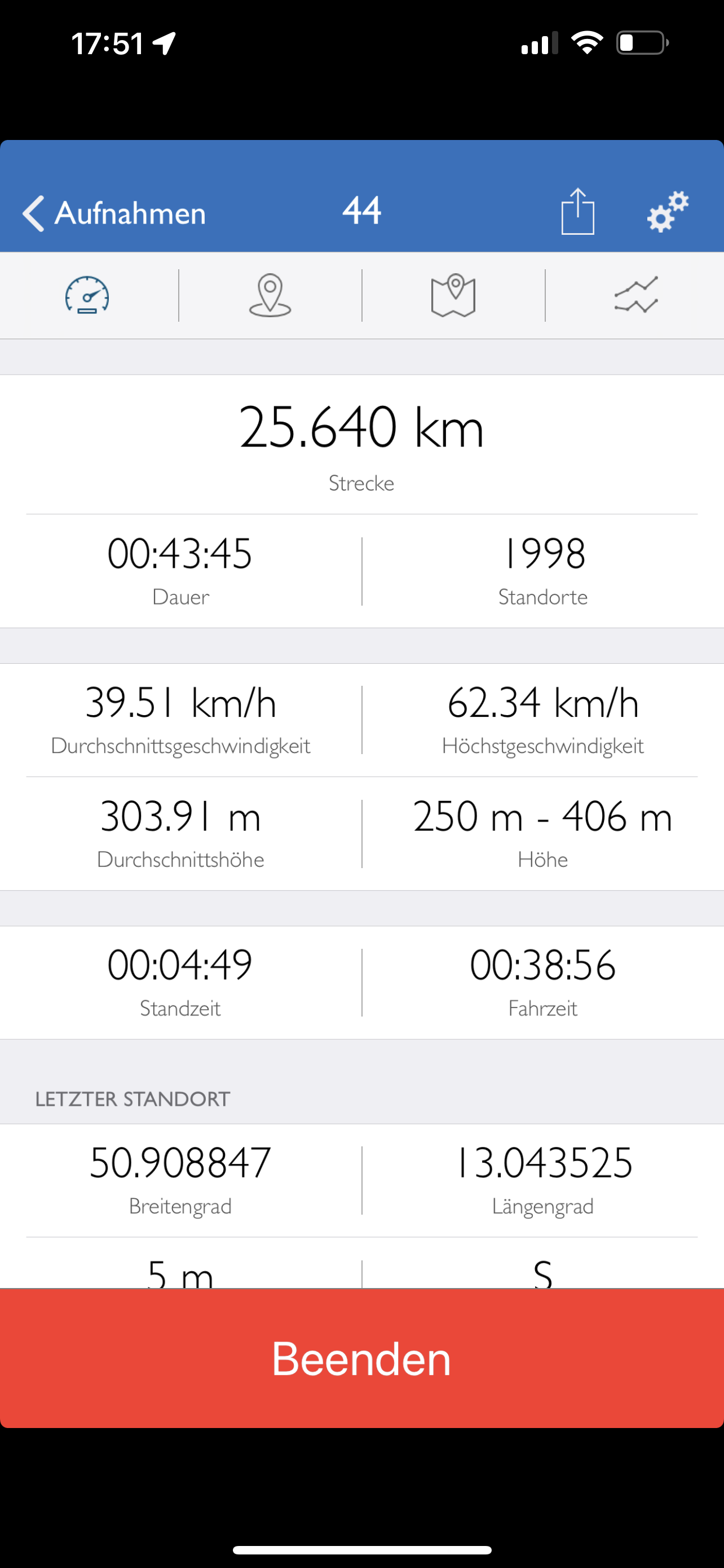 Siehe da, das neue zeigt 100%ig die reale Geschwindigkeit an. Tacho 45 = GPS 45. Und keine Abweichungen an der Fahrstrecke.