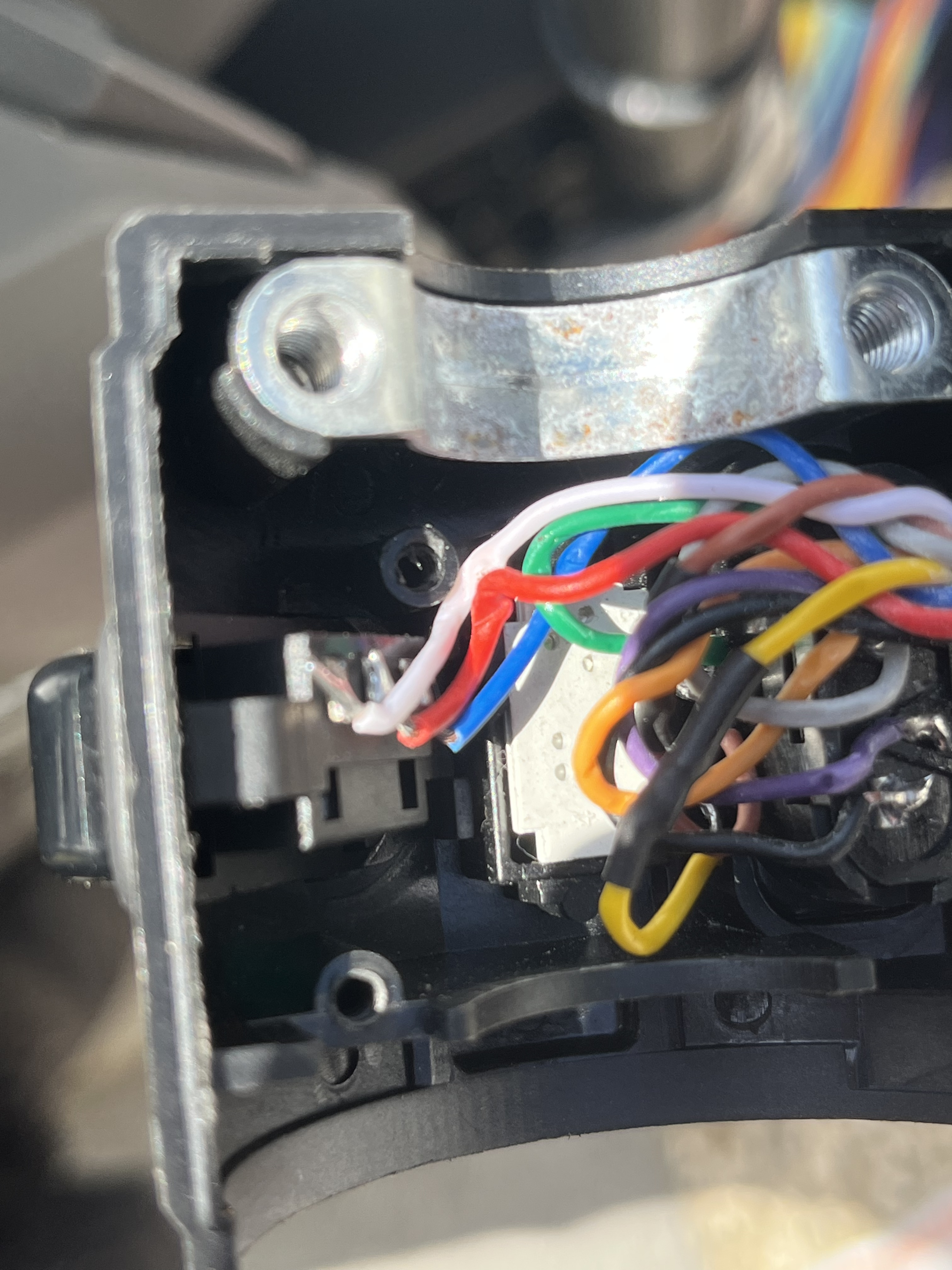 So sieht der Schalter von innen aus ist ein ganz einfacher Schalter. Weiß Rot Blau ist der Anschluss bei mir waren weiss und Rot kurzgeschlossen dadurch gab es ein Warn blinken egal auf welcher position.