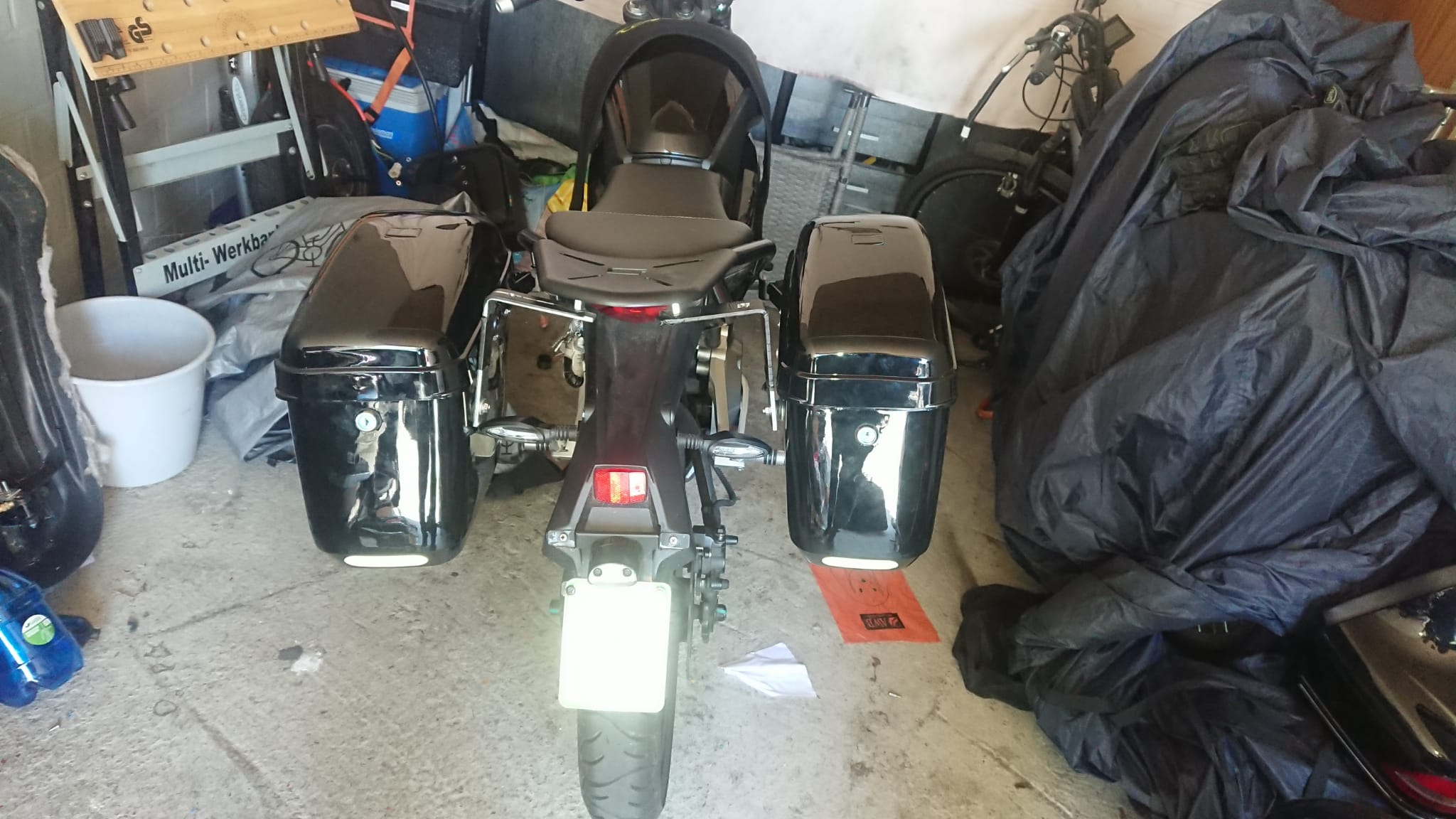 Weil ein Topcase sieht mir zu wuchtig aus und würde mie das aufsteigen erschweren. Da würe dann alles etwas Hecklasig. Das wird aber zu schwer aber Satteltaschen sollten schon gehen. Das habe ich noch in einem spanischen forum gefunden.