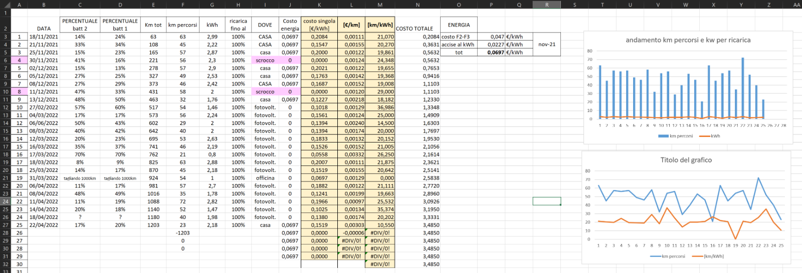 By the time had carried out 25 recharges, all documented and looking at the data of routes and recharges (ditto the kWh consumed to recharge it) I do not notice alarming variations, however the data collected are still few to be able to observe something: