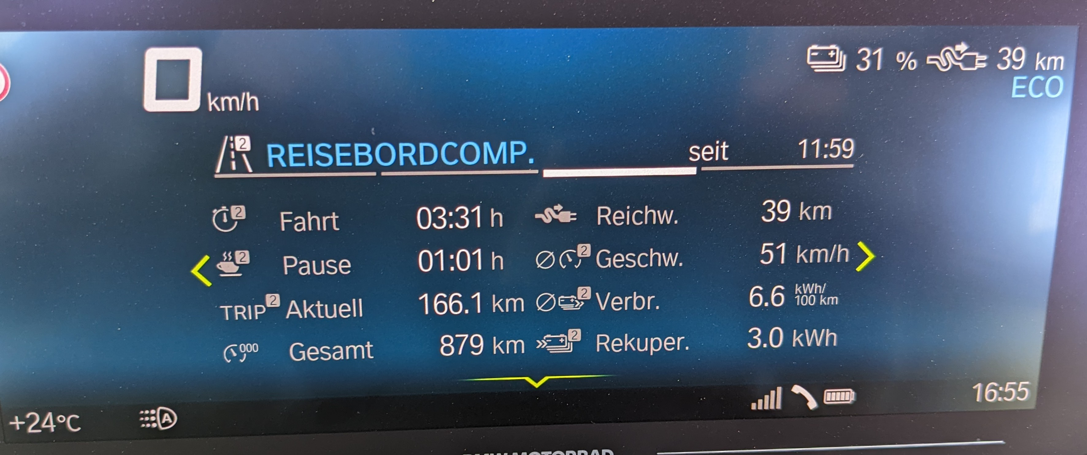 Ich habe also auf 166km Fahrt im Hügeligen lt.Anzeige 3kWh Strom produziert, entspricht einem guten Drittelliter Sprit vom Heizwert her.