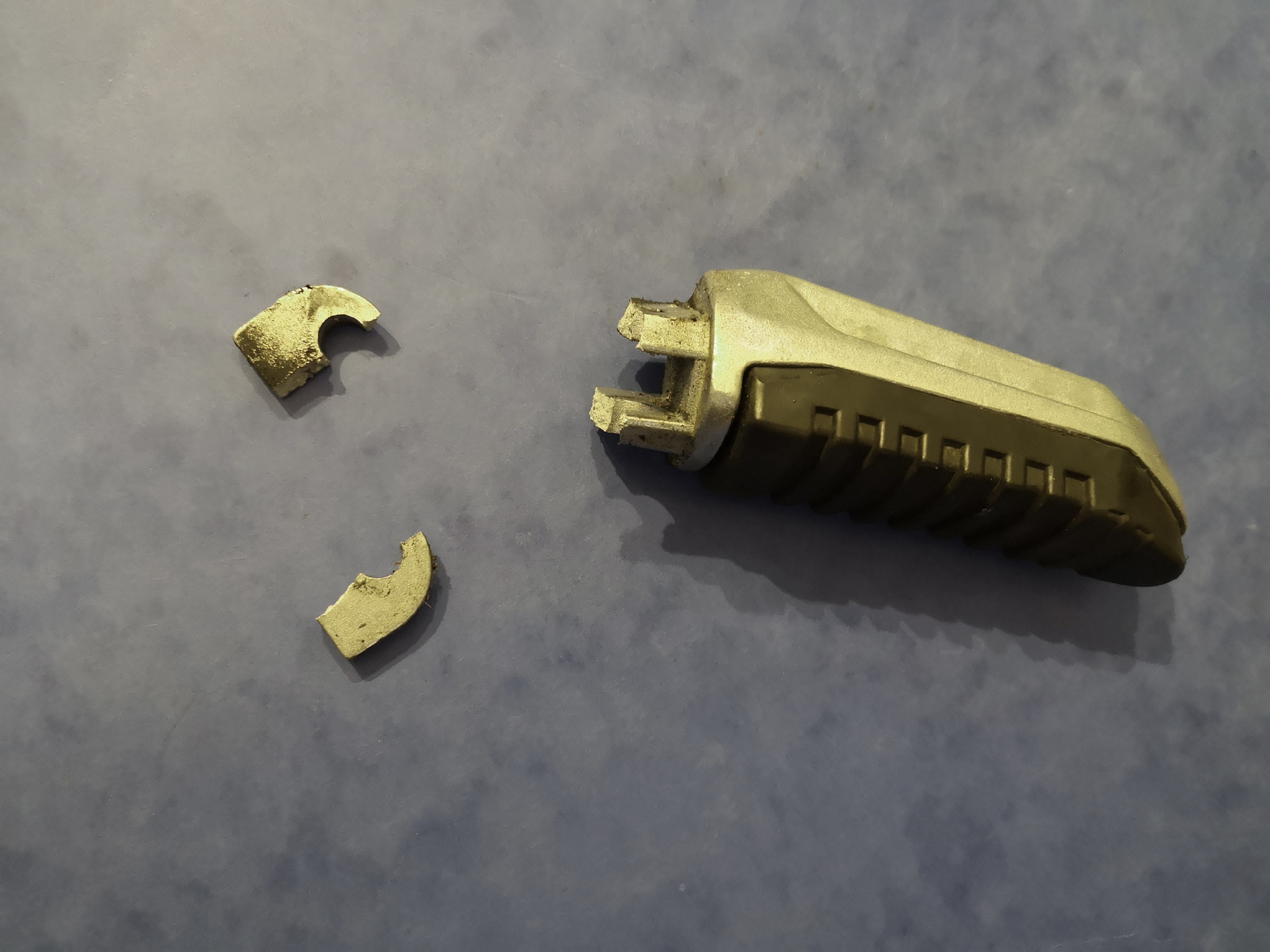 Ich fange mal mit der linken Fußraste an, die mir heute (beim Absteigen vom Bike) abgebrochen ist.
