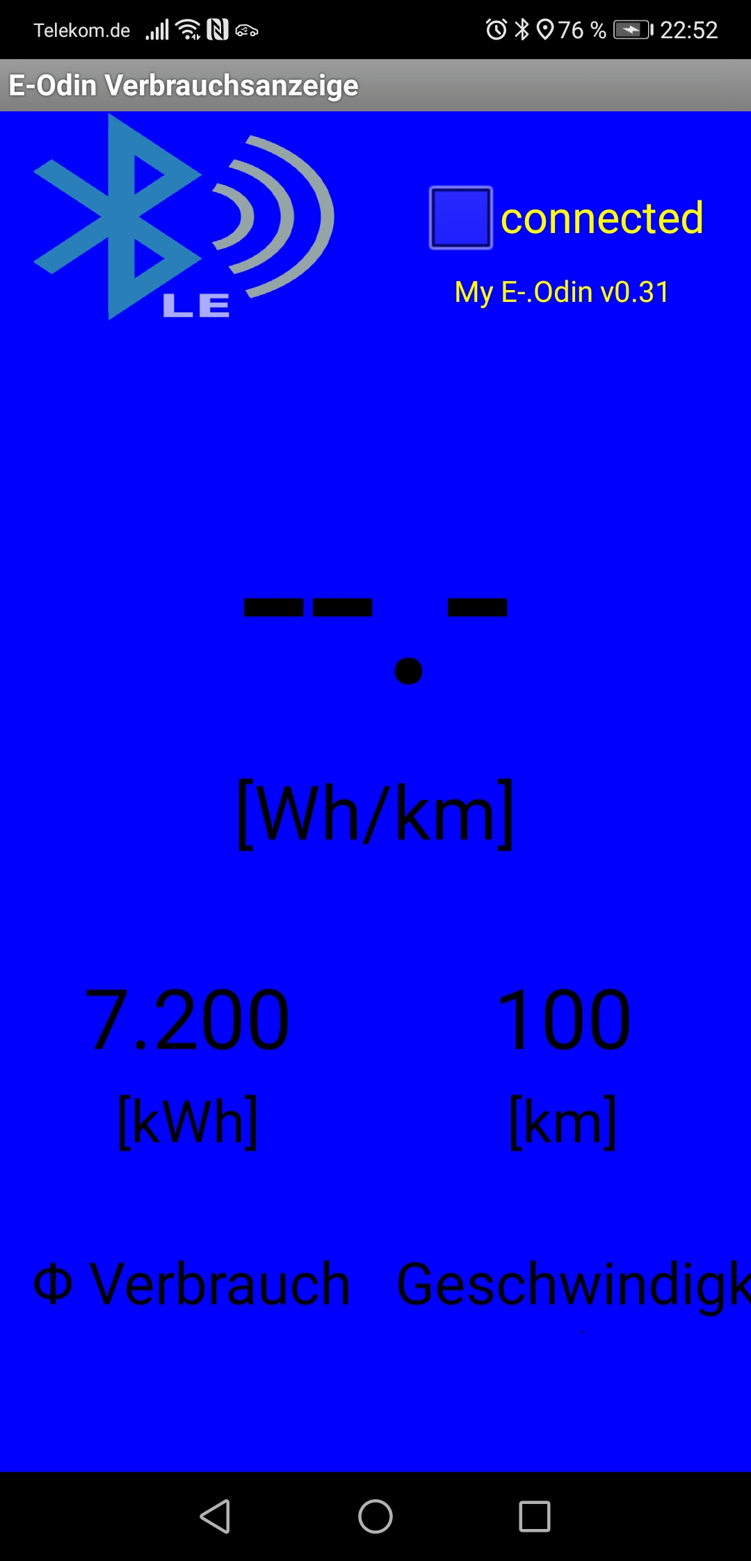 Mittlerweile hab' ich mir auch eine eigene Android App gebaut, welche die Daten via Bluetooth vom Coulomb-Meter abfragt, mit der Momentangeschwindigkeit (via Sensoren -> Location) verrechnet und mir die Wattstunden pro Kilometer ausgibt. Also eine echte Momentanverbrauchsanzeige :mrgreen: .
