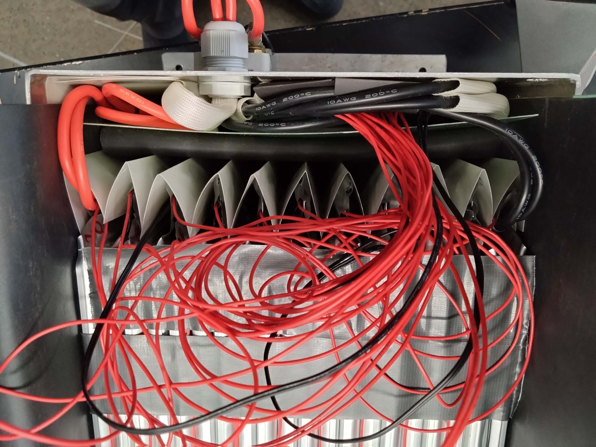 Die Alubox hatte in der Breite bewusst etwas Reserve. Einmal drinnen habe ich die Kiste seitlich hingelegt und den Spalt oben zwischen Alu und Gummi mit Bauschaum gefüllt. Davon gibts leider kein Bild. Nach dem Aushärten habe ich auf der Gegenüberliegenden Seite die Glasfaserplatte zwischen Alu und Gummi geschoben. So wurde noch etwas mehr Klemmdruck aufgebaut. Das BMS kam am Akku "Hinten" rein. Da da die Bohrungen für die Anschlüsse sind kam Poliesterfolie zur Trennung rein. Zwischen BMS und Akku kam wieder Gummi, Glasfaserplatte. Über die Akkuverbindungen kam gefaltet Polyester. Den Zwischenraum zum BMS habe ich stellenweise mit Bauschaum geschäumt. So sollte sich der Akku zu einem späteren Zeitpunkt wieder demontieren lassen. Verschlossen habe ich das Ganze mit Silikon, auch alle Bohrungen/Kabeldurchführungen wurden mit Silikon verschlossen. Beim klemmenbrett musste ich mit mit einem Standardteil von nem Drehstrommotor behelfen. M6 Anschlüsse. Oben auf der Box gehen 3 M4 Gewindestangen (Mit Silikon verdeckt) über den Deckel, halten Deckel und Box zusammen.