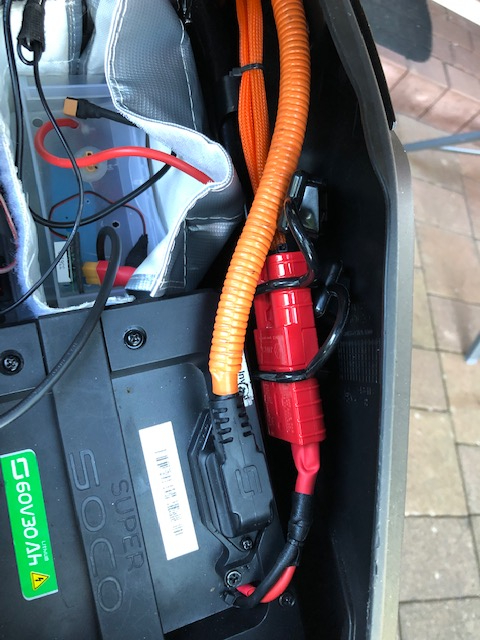 Grundgedanke ist, parallel zum Originalstecker eine zweiten Stecker für die 60V zu legen. Die Leitungen laufen parallel zu den original Kabel. Über die Sicherung zum Controller. Damit teilen sich die Stecker und die Leitungen die Ströme von der Batterie und werden weniger termisch belastet. Falls ich da ein Denkfehler habe... Bitte Rückmeldung.