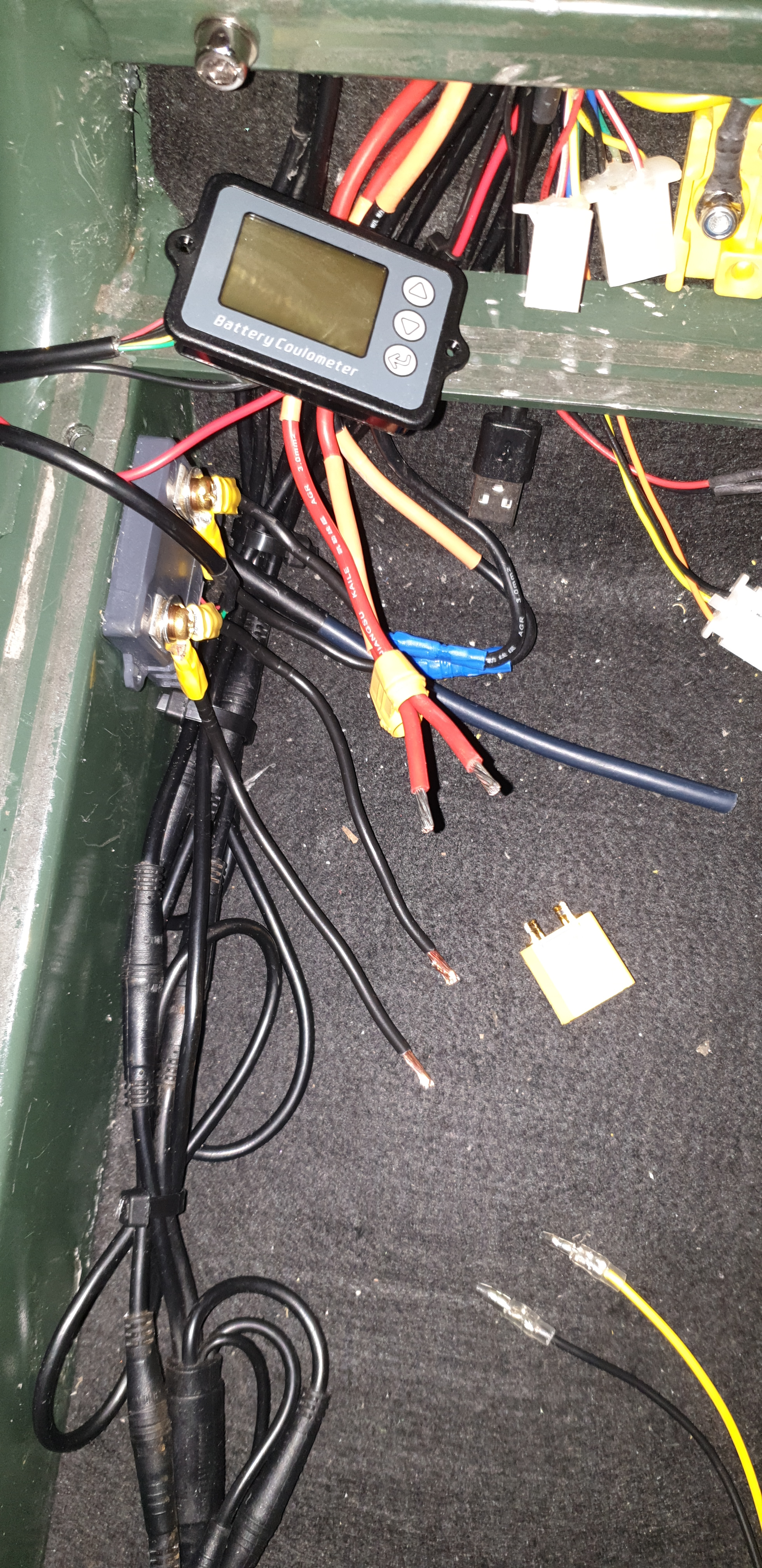 Der GPS-Tracker, Alarmanlage wurden vorseitig unter das Blech befestigt und bekommen über den zweiten XT-90 Ausgang und den 12 V Converter des Akkus permanent Strom. Der andere 12 V Converter dient den 2x USB-C Anschlüssen.