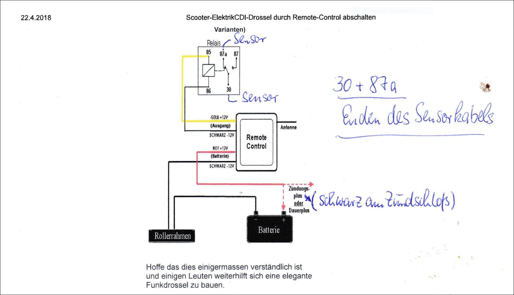 So ähnlich, Relais muß 2 Wechsler haben. Nach dem der Roller gestartet ist, akiviert man mit FB das Relais, dieses trennt mit dem ersten Wechsler die Sperre und hält sich dann über den 2ten. Bei Zündung aus geht alles in Ruhelage und die Spezis können dann eine Runde drehen mit 45 km/h