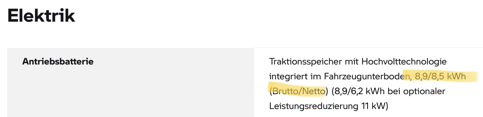 Meine Frage bezog sich auf den Unterschied brutto/netto...bei meinem phev habe ich Zugriff auf ca. 12kwh, die restlichen 2,4kwh sind die akkureserven zum lebenserhalt des akkus, an die ich nicht rankomme, weder beim auf 0 runterfahren noch beim Vollladen auf 100%.