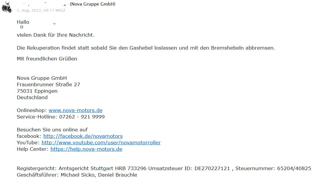 Wie gesagt, Nova-Motors sagt Gashebel loslassen UND mit den Bremshebeln abbremsen (siehe Screenshot der Antwort auf meine Anfrage bei Nova-Motors).