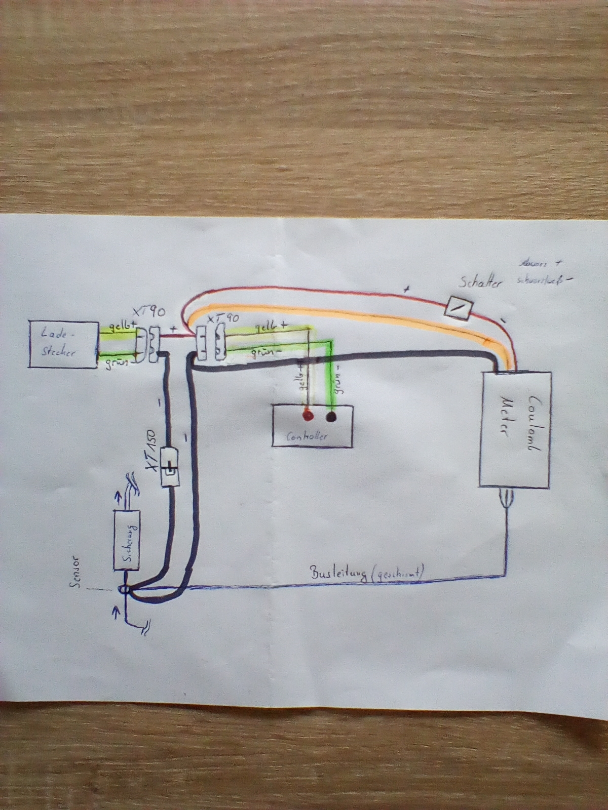 Kleine Korrektur für Deine Skizze: da wo "Controller" steht, muss "Akku-Ladeanschluss" stehen. Das Kabel mit den XT90 Connectoren verbindet Akku und Ladebuchse (und da schleifen wir uns hier mit unserem Zwischenstück ein).