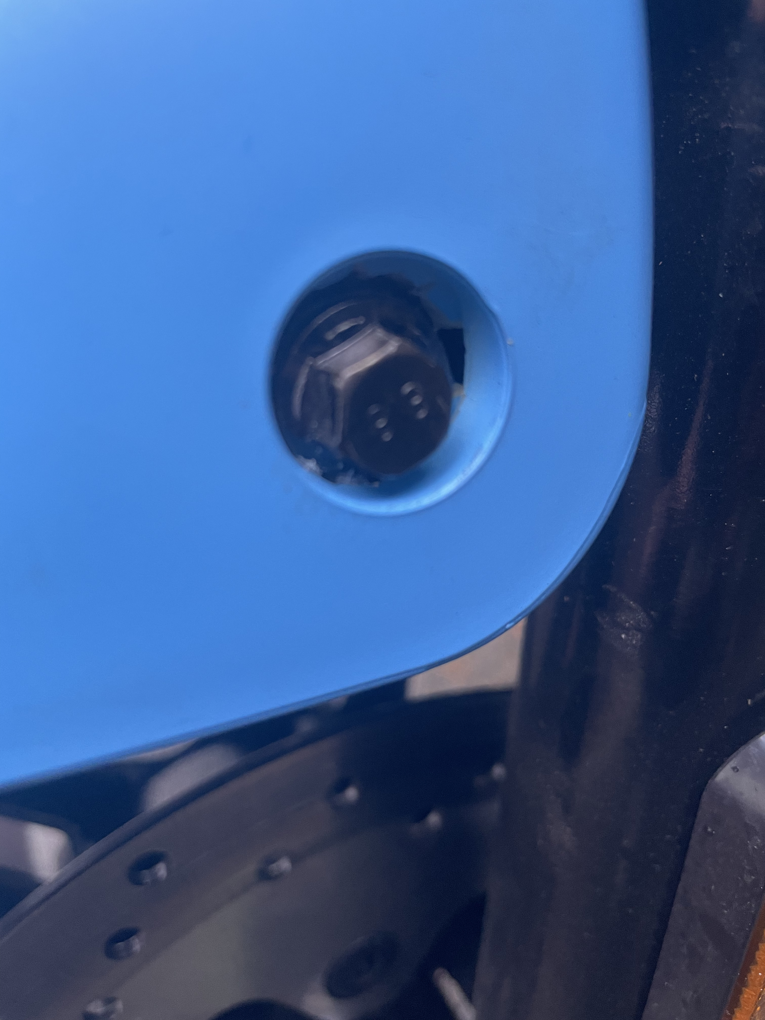Bei näherer Betrachtung der Front wurde ein Bruch der Verkleidung an der Verschraubung der Schürze am Vorderrad festgestellt.