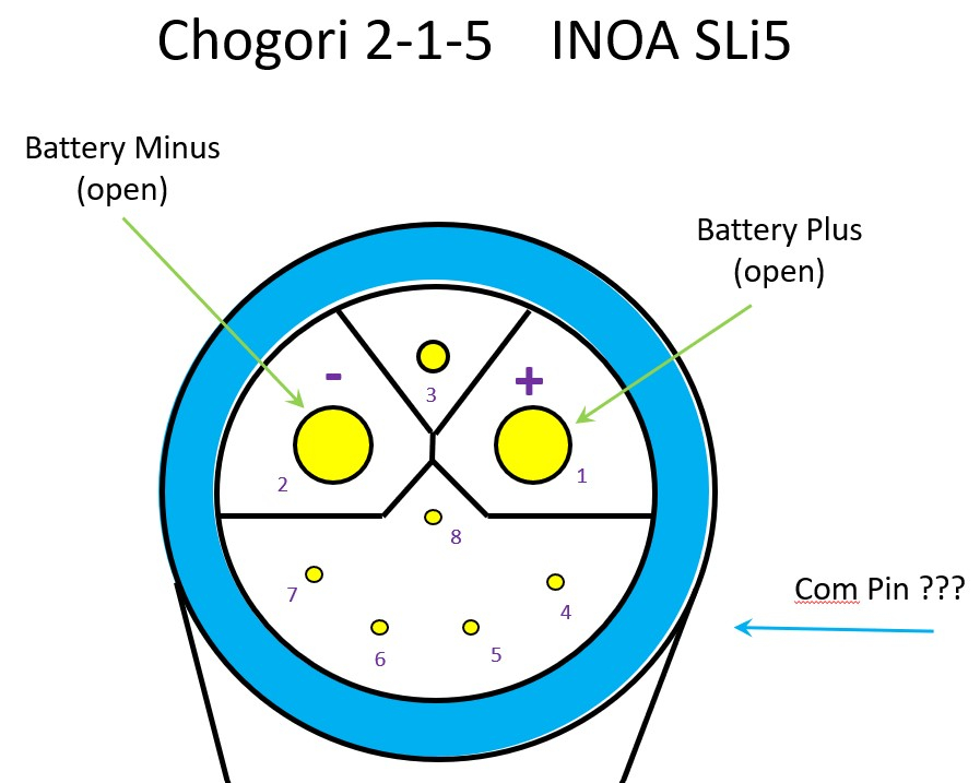 Offenbar verwendet INOA hier das BMS nicht für die Schaltung von Power ON, sondern die dicken Pins im Stecker erwarten direkt eine offene Verbindung zum Akku, genutzt für Laden und Fahren (wieder was gelernt). Das macht die Akku-Umrüstung hier natürlich einfacher. Über zwei der dünnen Kommunikations-Pins (nicht genormt: einige Hersteller nutzen Pin Nr. 5 und Nr 6, andere 4 und 7) wird der originale Akku die Infomation zum Ladeszustand an das Display übertragen, die mit einem alternativem Akku dann fehlt.