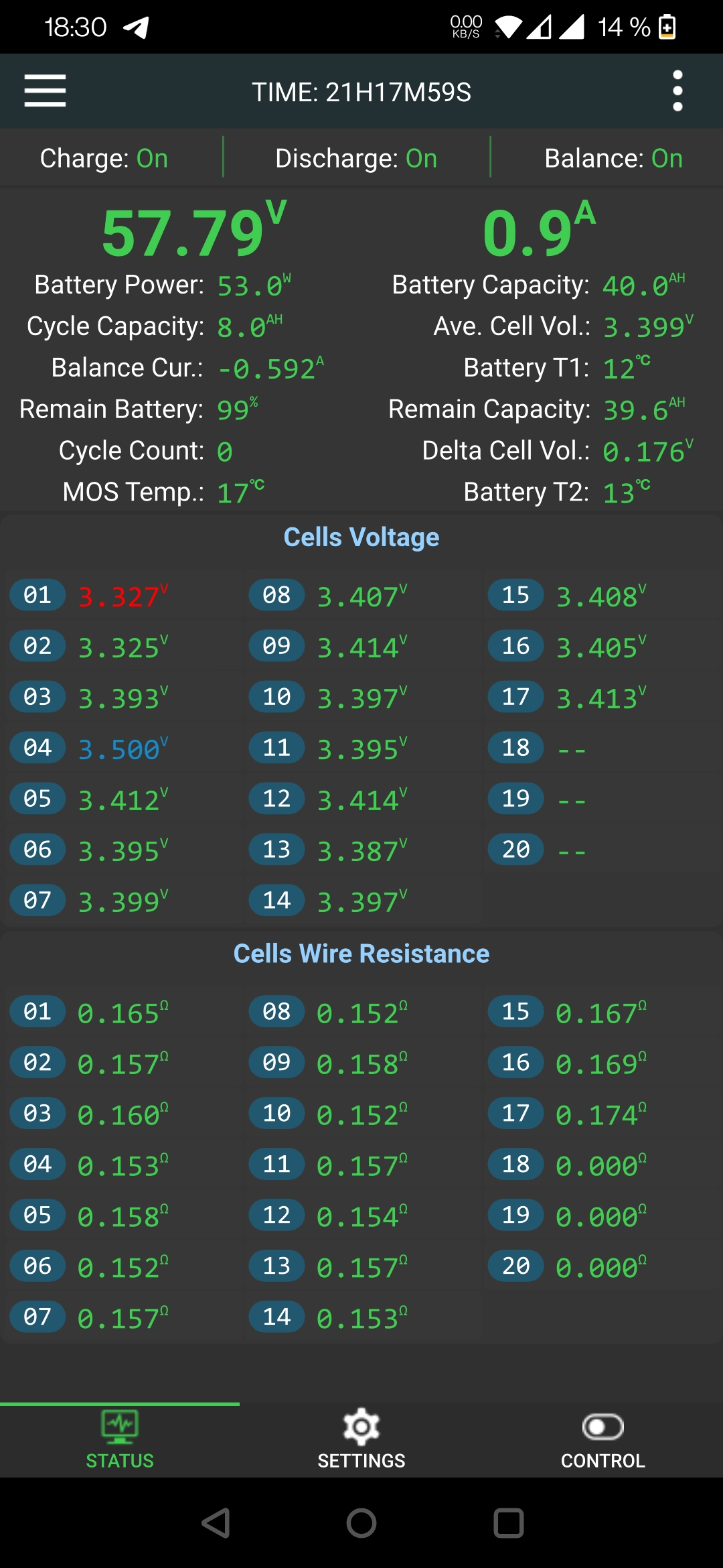 Ich vermute, dass die Cell Wire Resistance auch den Innenwiderstand der Zellen messen. Sieht bei dir aber gur aus. Bei Werten > 0,75mOhm fängt das JK BMS an zu meckern - balanciert nicht mehr.