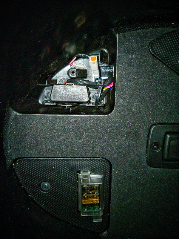 Nachdem die Kabel (schwarz, blau, braun) an ihren jeweiligen Anschlüssen angelötet wurden (das zentrale Blau ist die Masse), ging ich zur Montage in dem bereits im Seat Mò vorhandenen Loch über und verband dann den Stecker mit dem des Lagersystem (Foto des Beitrags oben).