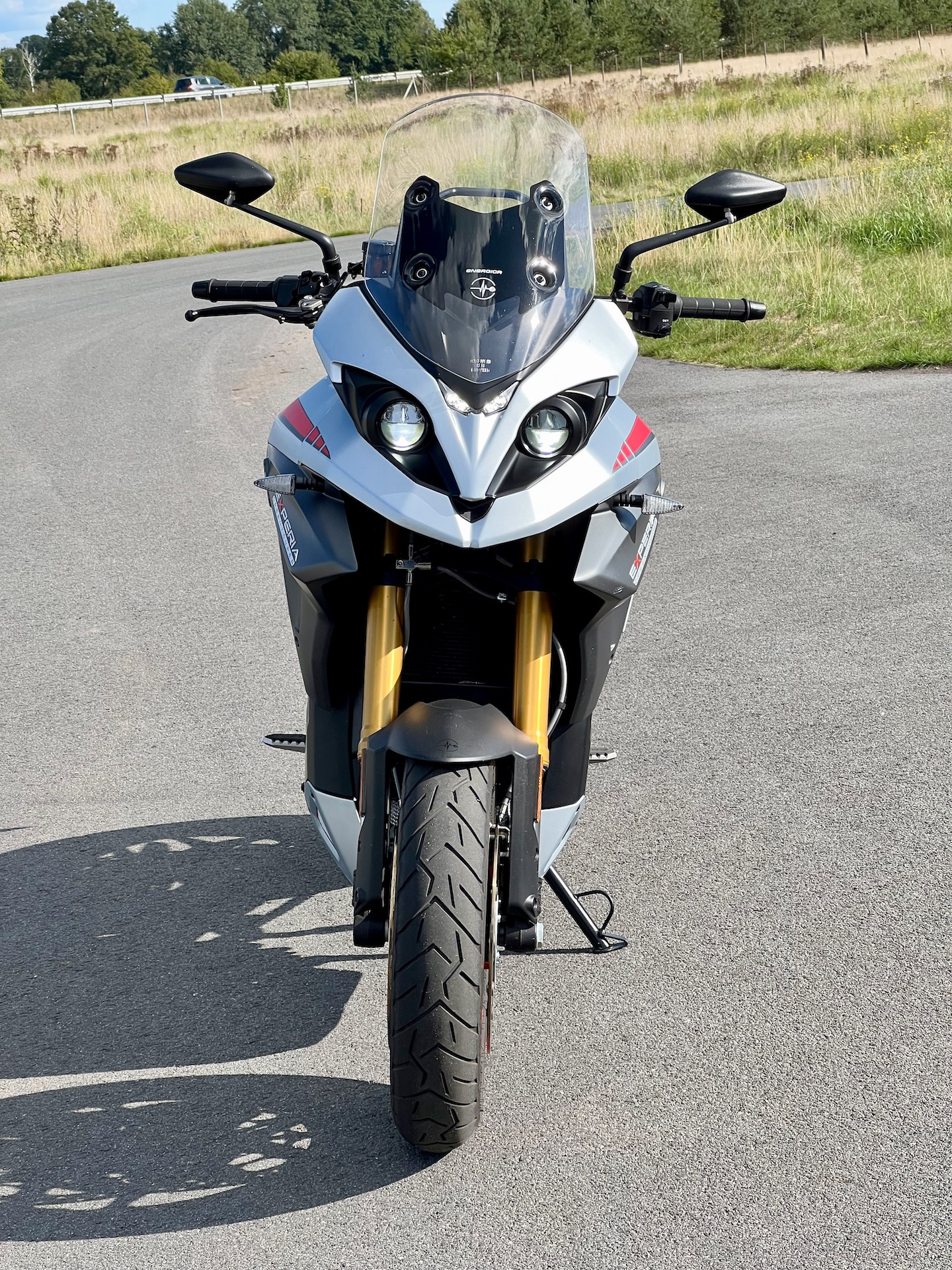 Erst mal im Menü volle Leistung und volle Reku eingestellt, und dann… Herrlich sattes Drehmoment! Kenn ich von der Ribelle, die davon noch ne Schüppe mehr hat. Und dann das Handling - ein Traum! Tiefer Schwerpunkt, gut ausbalanciert, absolut neutrales Einlenkverhalten. UND GENAU DAS HATTE ICH IN MEINEN 3 JAHREN ENERGICA VERMISST. Die Experia fährt sich auf den ersten Metern quasi wie ein Mountainbike. Gedacht, gelenkt, gefahren. Dieses Verhalten bleibt bis etwa 110km/h gleich, soweit eben wie ich es testen konnte. Die Ribelle liegt zwar noch satter auf der Straße, sie braucht aber mindestens 40 oder 50km/h, um danach erst neutraler zu werden. Und sie lenkt sich nicht so leicht. Die Experia zeigt das spielerisch-leichte Lenkverhalten** quasi aus dem Stand schon. Das konnte auch meine GS nicht besser!
