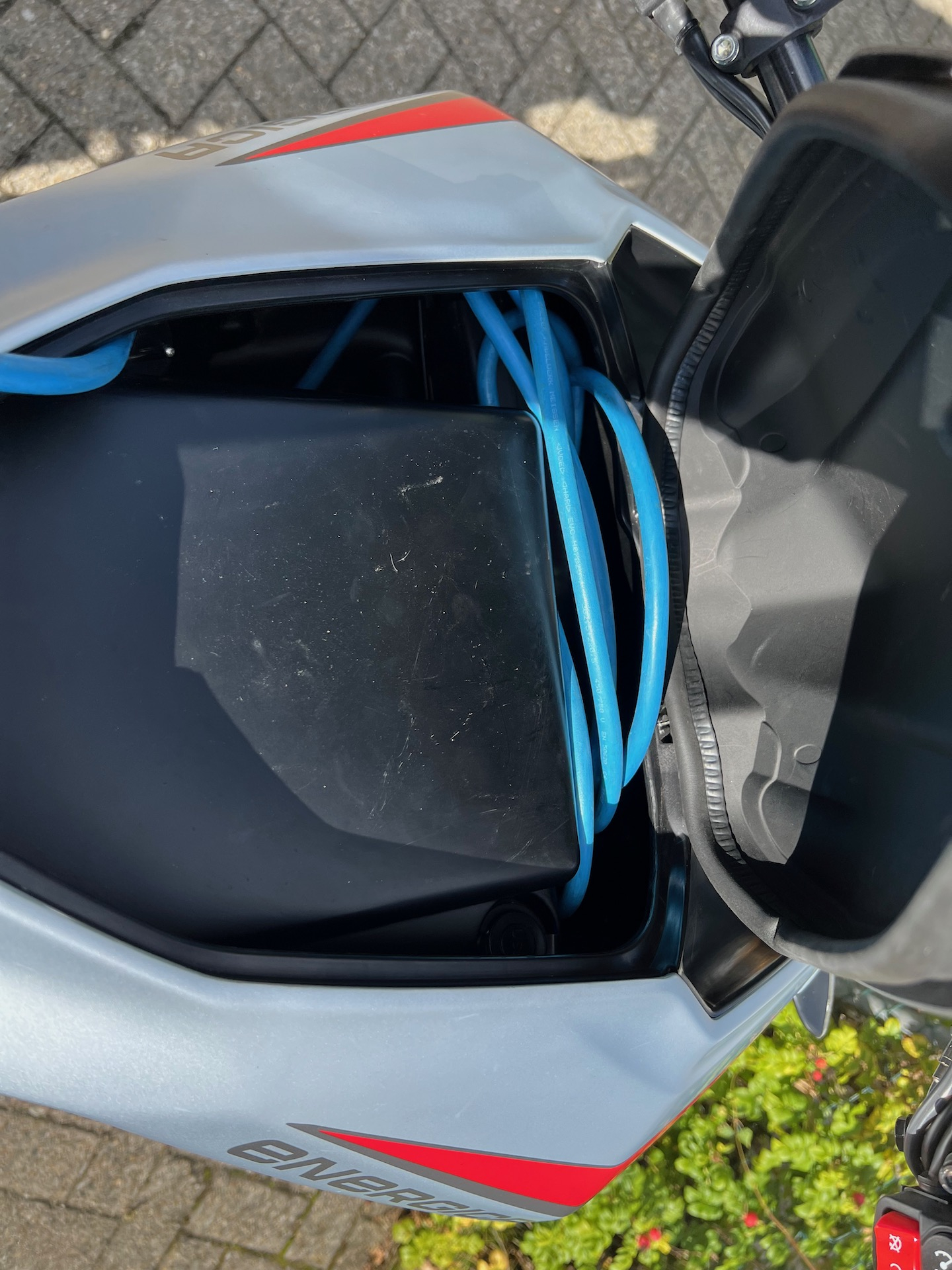Dass das Hauptfach (wird per langem Druck auf den Daumen-SET-Taster entriegelt) klein ist, konnte ich schon den Testvideos der Vorstellung entnehmen. Schön ist, dass dann doch ein Typ2-Kabel verstaut werden kann. Könnte mir vorstellen, dass auch ein ungefütterter Regenkombi noch reingestopft werden könnte. Es wurde aber kolportiert, dass da ggf. noch eine Art Schale oder Innenauskleidung rein kommt - was auch Sinn macht. Denn wenn mal Kleinteile links oder rechts in den Raum neben dem Akku fällt, dann gute Nacht. Der Spalt ist für eine Erwachsene Hand zu schmal.
