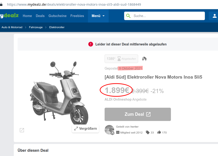 Im Herbst 2021 gabs den Roller bei Lidl (?) für ca. 1800€!