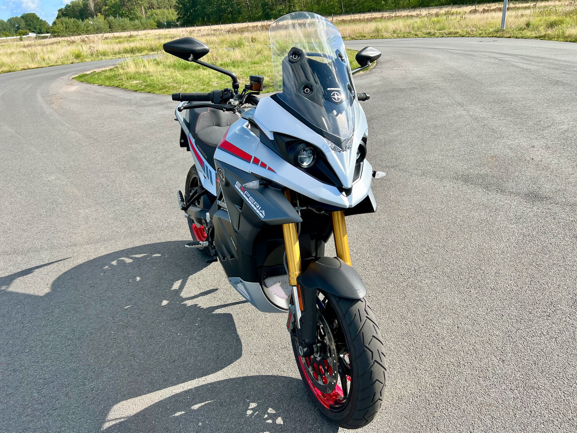 Hab ja oben schon einiges zur Verarbeitungsqualität geschrieben. Das war sicherlich unfair, da es sich hier um ein Vorserienfahrzeug handelt. Und es ist auch logisch, dass man mit viel mehr Verkleidung natürlich auch mehr Kunststoff um sich herum hat und es dann schneller wie ein Plastikbomber wirkt. Das Design gefällt mir persönlich aber sehr gut – ich sehe da viel Ähnlichkeit mit der Ducati Multistrada. Design können die Italiener eben gut! Trotzdem ist sie immer noch eigenständig genug. Die Seitenansicht finde ich weniger gelungen. In dieser Perspektive betonen die Verkleidungen rund um den Akku dessen Rechteckigkeit. Nun ja, das ist halt so – ich weiß nicht, ob man das Design noch gefälliger hätte hinbekommen können. Bei meiner Ribelle sieht es zumindest ein wenig dynamischer aus und die Konturen des Akkus sind optisch besser kaschiert. Trotzdem finde ich persönlich das Gesamtpaket sehr gefällig.
