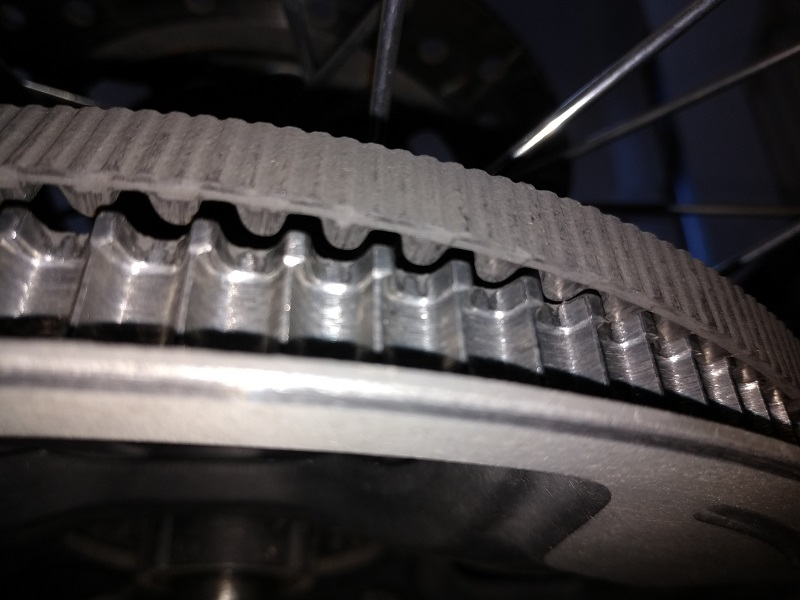 Hier noch Bilder von der hinteren Zahnriemenscheibe bei km-Stand 8.500 (leider schlechte Bildqualität): Die Abnutzung finde ich ziemlich drastisch, ich hatte aber ca. 4 Wochen eine Baustelle mit verschlammter Straße auf meinem Arbeitsweg.
