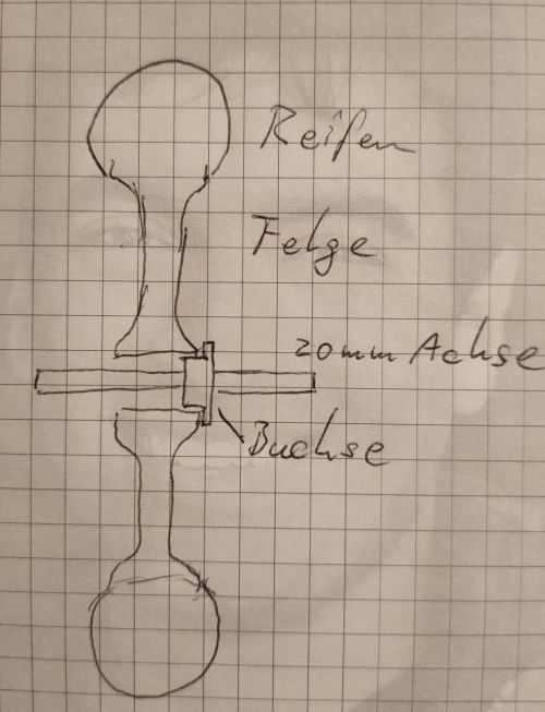Die Masse hatte ich ergänzt, also optimal wären 30mm Zylinderlänge plus den Kragen, dessen Länge ist egal. 5-10mm, je nach Material, muss nur robust sein. Funktioniert nur als Anschlag für die Felge. Länger geht immer, aber man muss kein Material verschwenden.