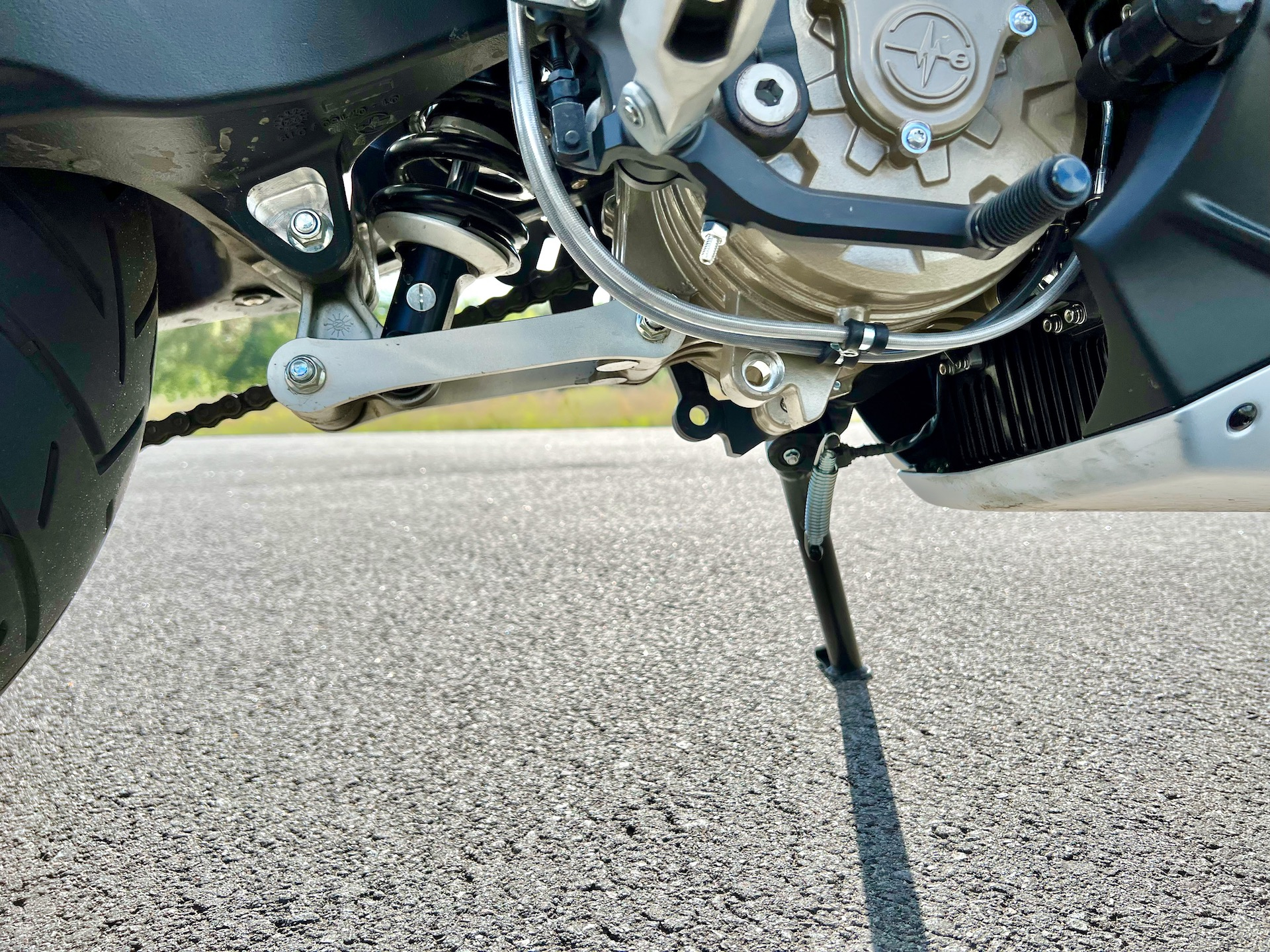 Gehört zwar nicht hierher, ist aber irgendwo auch Teil des Fahrwerks (na ja, doch eher des Rahmens): Der Ständer. Der Vorführer hatte nur den Seitenständer, im Konfigurator kann man aber deutlich einen Hauptständer erkennen. Und da, wo der Hauptständer verschraubt ist, hat der Vorführer Befestigungsaugen. Mein Händler konnte nicht sagen, ob da nun der Hauptständer kommt, oder nicht. Tatsache ist: Er ist im Zubehör jetzt Stand September 2022 gar nicht gelistet. Mein Tipp: Hauptständer wird es im Zubehör von Energica selbst geben.