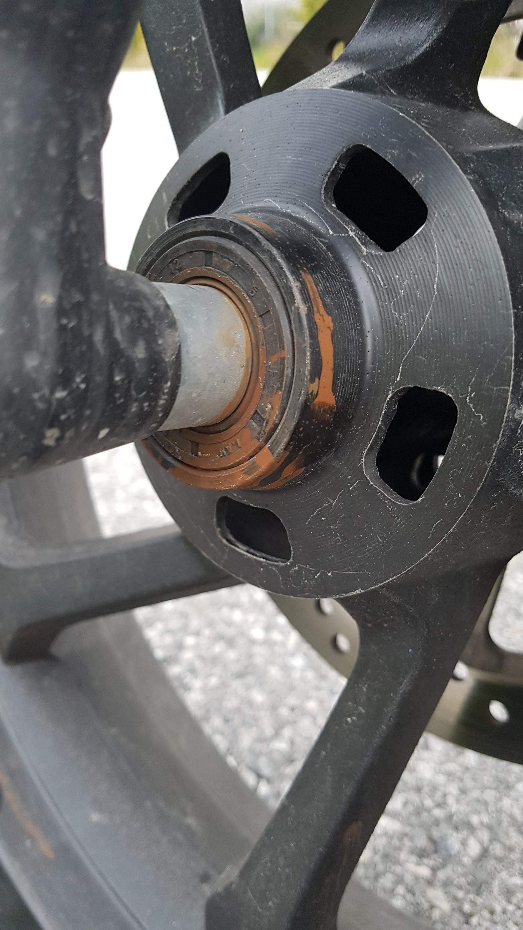 mir ist vor kurzem eine komische braune Farbe aufgefallen, die sich über meine Felge des Vorderrades verteilt hat. Bei genauerem Hinschauen konnt ich als Ursprung den Bereich der Vorderachse bzw. des Radlagers ausmachen (siehe Foto). Das Ganze muss irgendwo von innen kommen und hat sich dann durch die Fliehkraft über die Felge verteilt. Für mich schaut das nach nach rostiger Flüssigkeit aus.