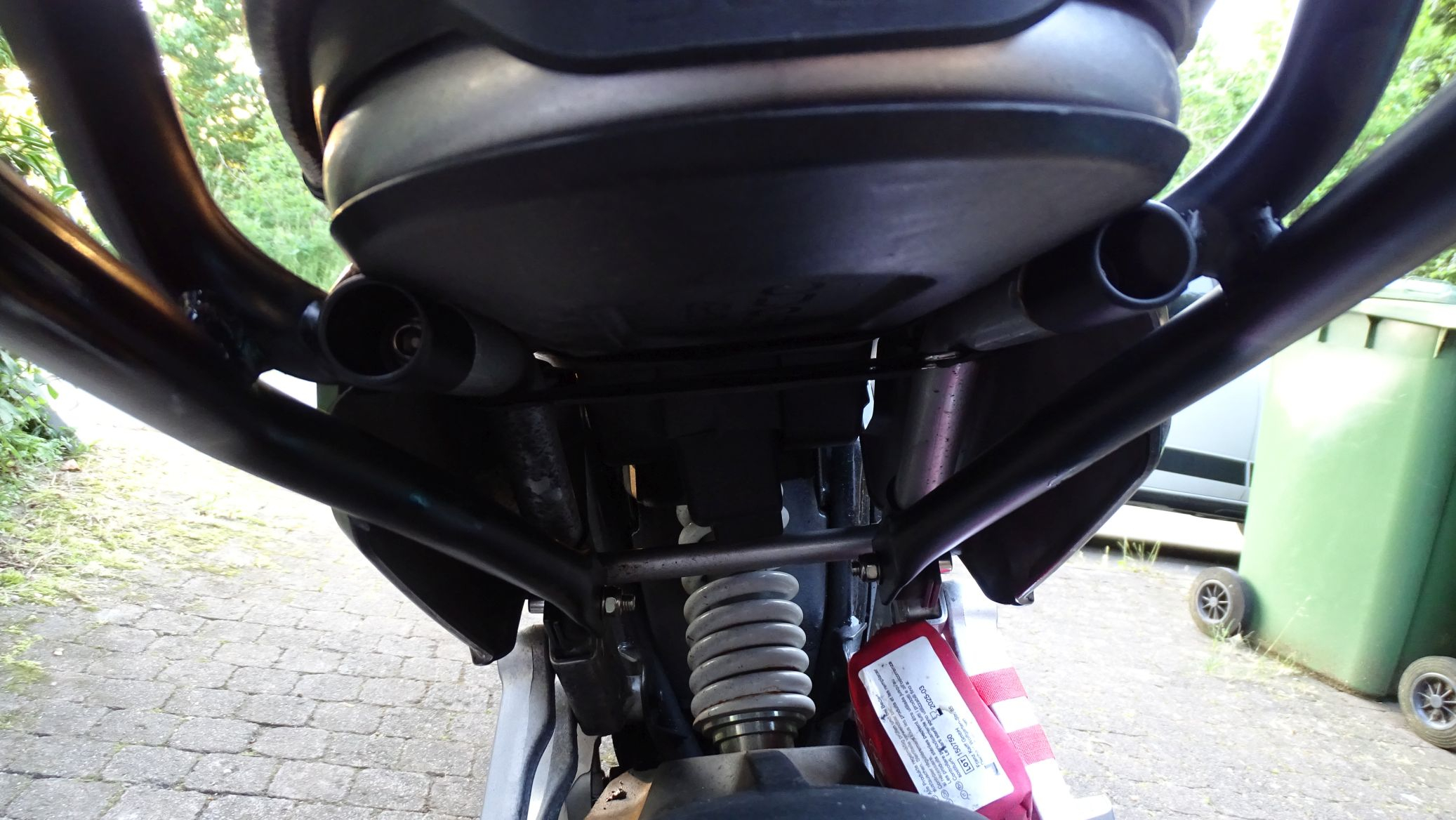 Selbst unbeladen musste ich ganz langsam über Schwellen und abgesenkte Bordsteine fahren sonst hatte ich wieder einen verbogenes Nummernschild. Mit meinen 62kg habe ich auch keinen Tiefgang auf dem Moped. Die Schrauben sind 3 mal gebrochen. Die neue Halterung ist gar kein Vergleich zu der Shad. Massiver dicker Stahl vernünftig an 4 Punkten befestigt. Hätte gleich diesen nehmen sollen.