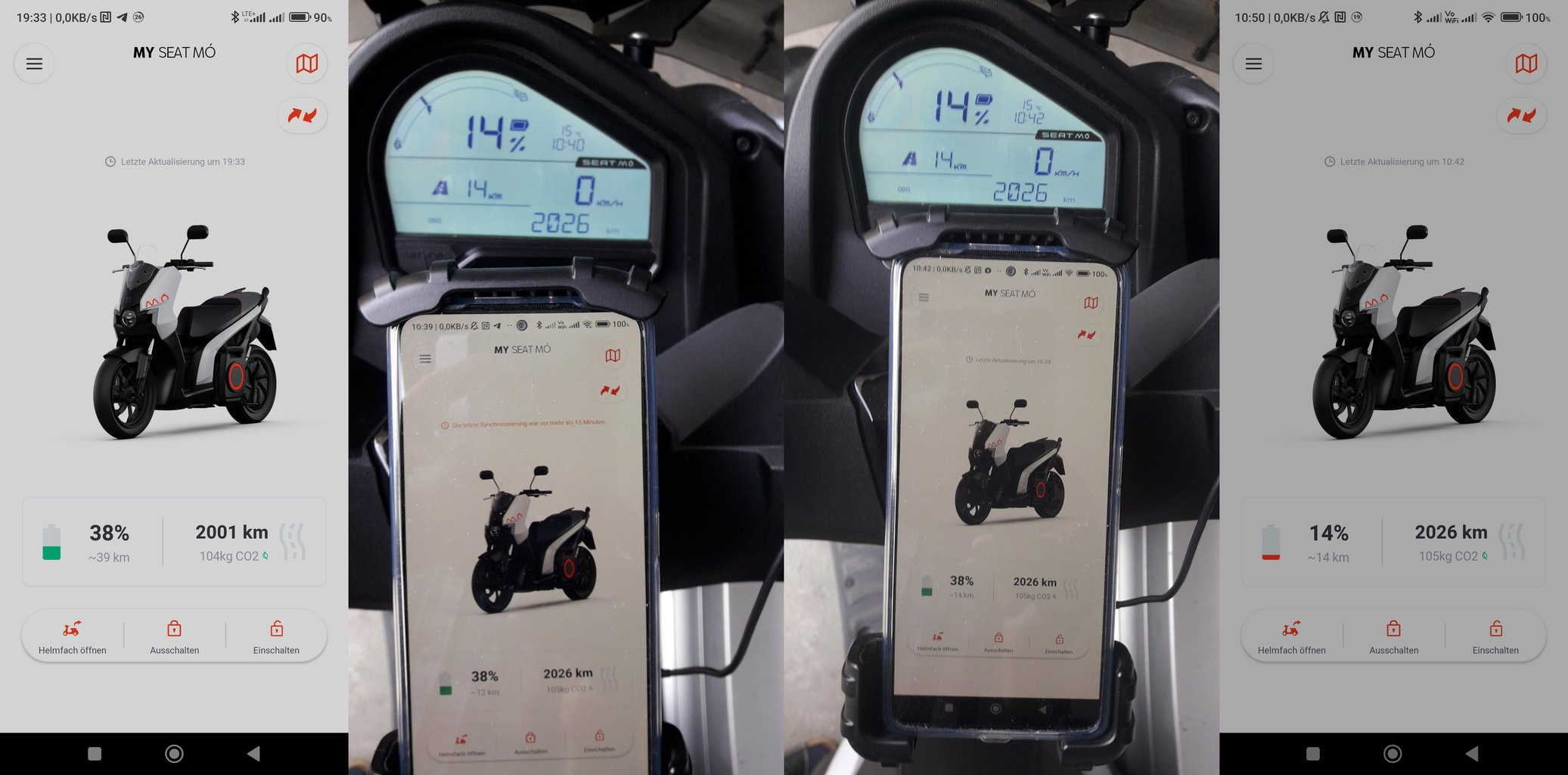 Heute auf einer Fahrt in die Innenstadt vom dicken B hatte ich am Ziel einen SoC von 92% in der App. Das war in etwa der Stand beim Losfahren :lol: GPS-Position war von der letzten Kreuzung, ca 300 Meter entfernt vom Abstellort, nach 15 km Fahrt. Während des gesamten Aufenthalts dort (im Freien!) gab es keinen Connect (Meldung in der App: "seit mehr als 15 Minuten keinen Aktualisierung"). Später zu Hause angekommen, war der SoC in der App noch immer auf 92% - aber ODO stimmte! Die mit dem Handy geloggten Telemetriedaten wiesen aber eindeutig (klarschriftlich als auch im SCUTUM S01:Report) 61% (wie auch auf dem Display) aus. Das hatte sich dann seltsamerweise eine Viertelstunde später auch in der App ergeben.