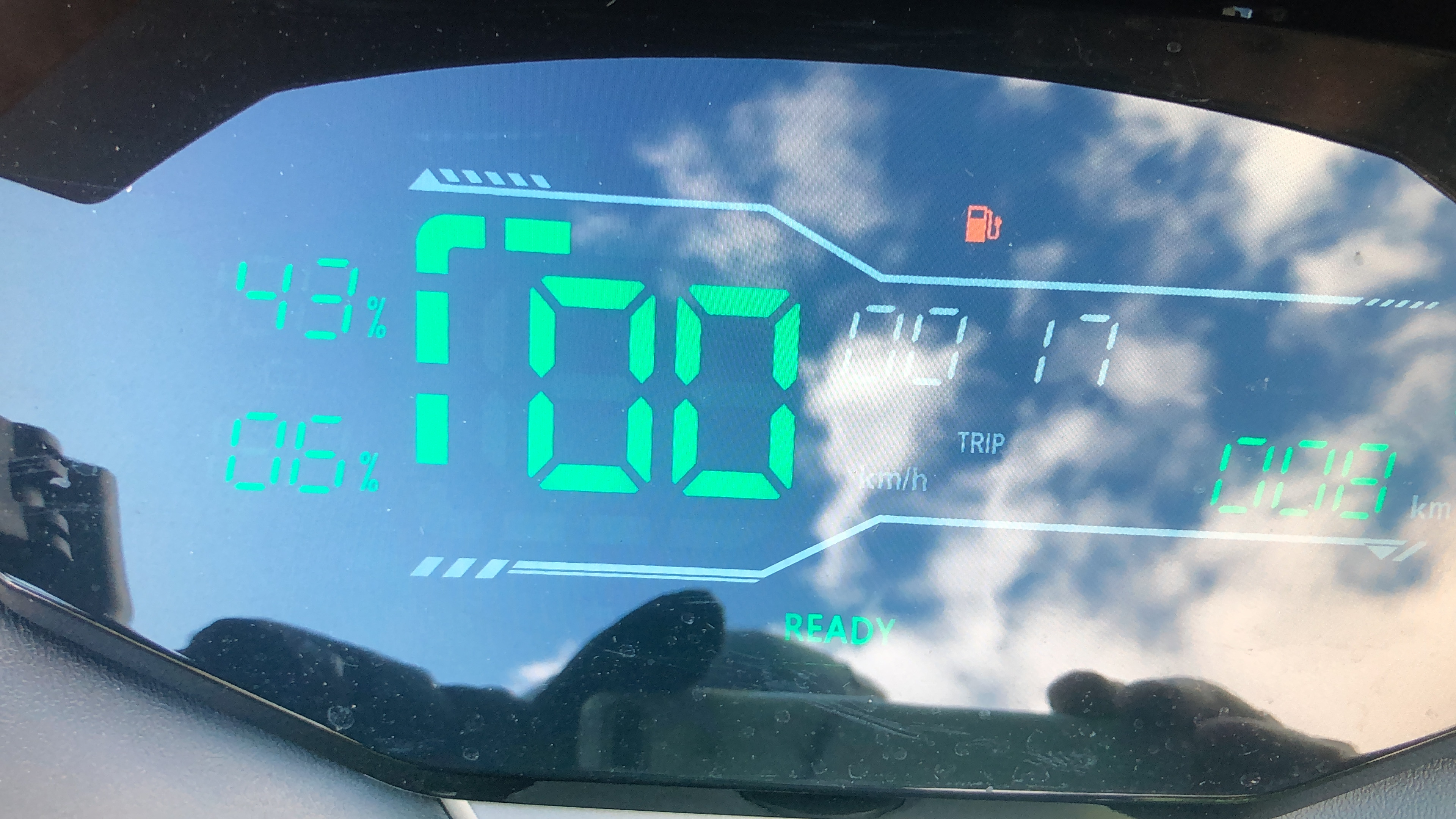 Nach 40 Kilometer regelt der Roller auf 45 km/h runter und im Display leuchtet das Ladensymbol auf.