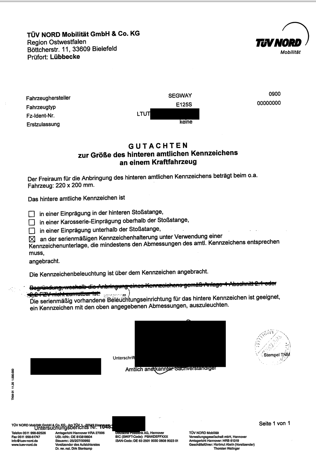 In dem Gutachten muss zu sehen sein, dass ein normales Motorradkennzeichen gut befestigt werden kann welches auch vernünftig beleuchtet wird.
