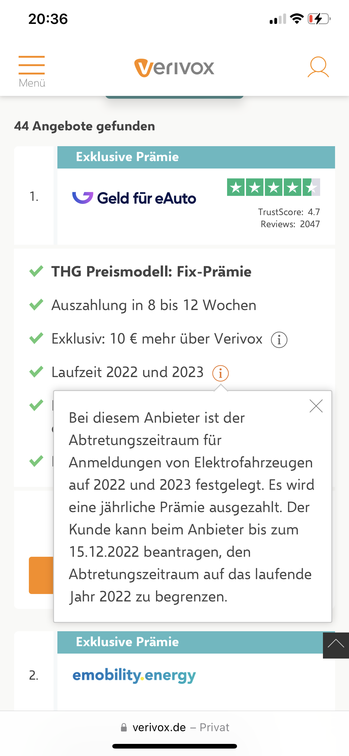 Ich habe auch, über Verivox, bei "Geld für eAuto" abgeschlossen. Mir wurde schriftlich versichert dass am 01.01.23 meine THG-Prämie für 2023 beim Bundesumweltamt eingereicht wird. Wenn diese genehmigt ist (bis zu 12 Wochen), wird sie vermarktet.
