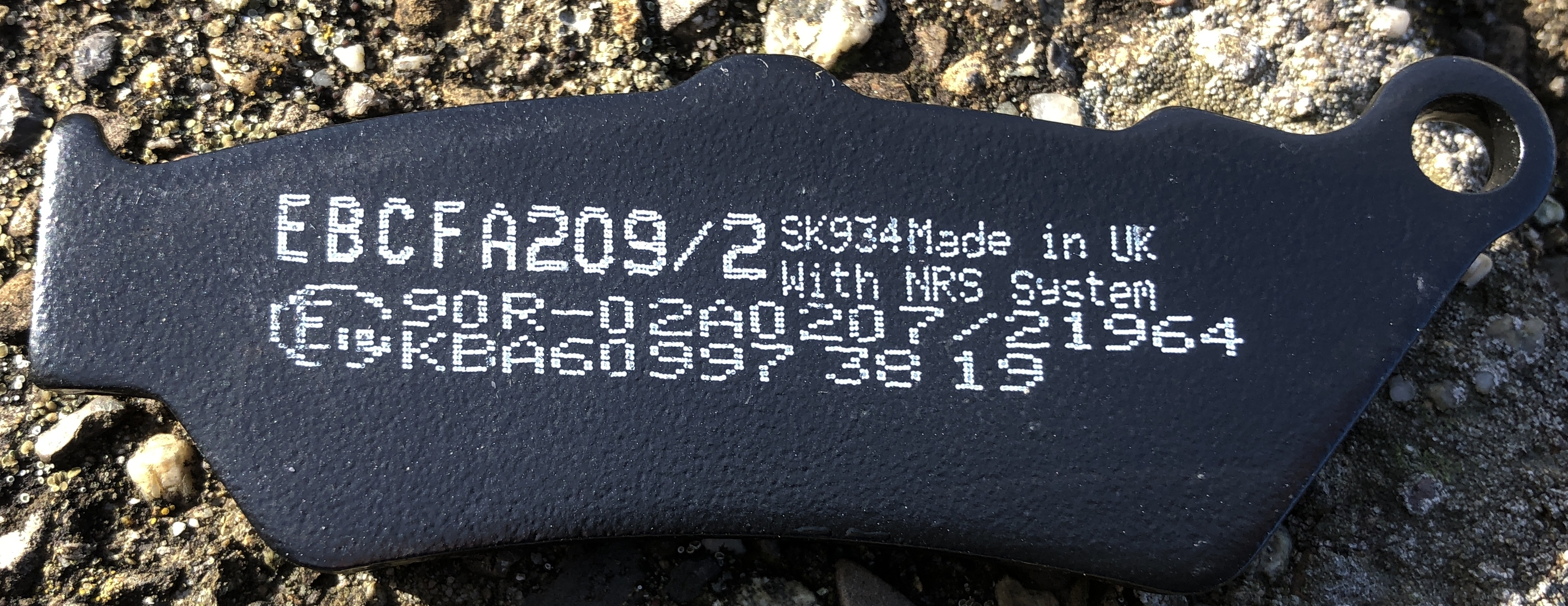 Nachdem schon seit längerem leichte Schabgeräusche von vorn kamen, wenn sich das Vorderrad seitlich verschob (Vorderachse ist immer noch nicht geflickt, weil wir immer noch auf den neuen linken Showa Dämpfer warten...), hat sich das Schabgeräusch zunehmend auch beim Bremsen eingestellt - höchste Zeit für den Bremsbelagswechsel! Die haben ein Rückenblech mit umgebogenen Kratzfüßen zur Meldung, dass der Belag gleich ganz weg ist.