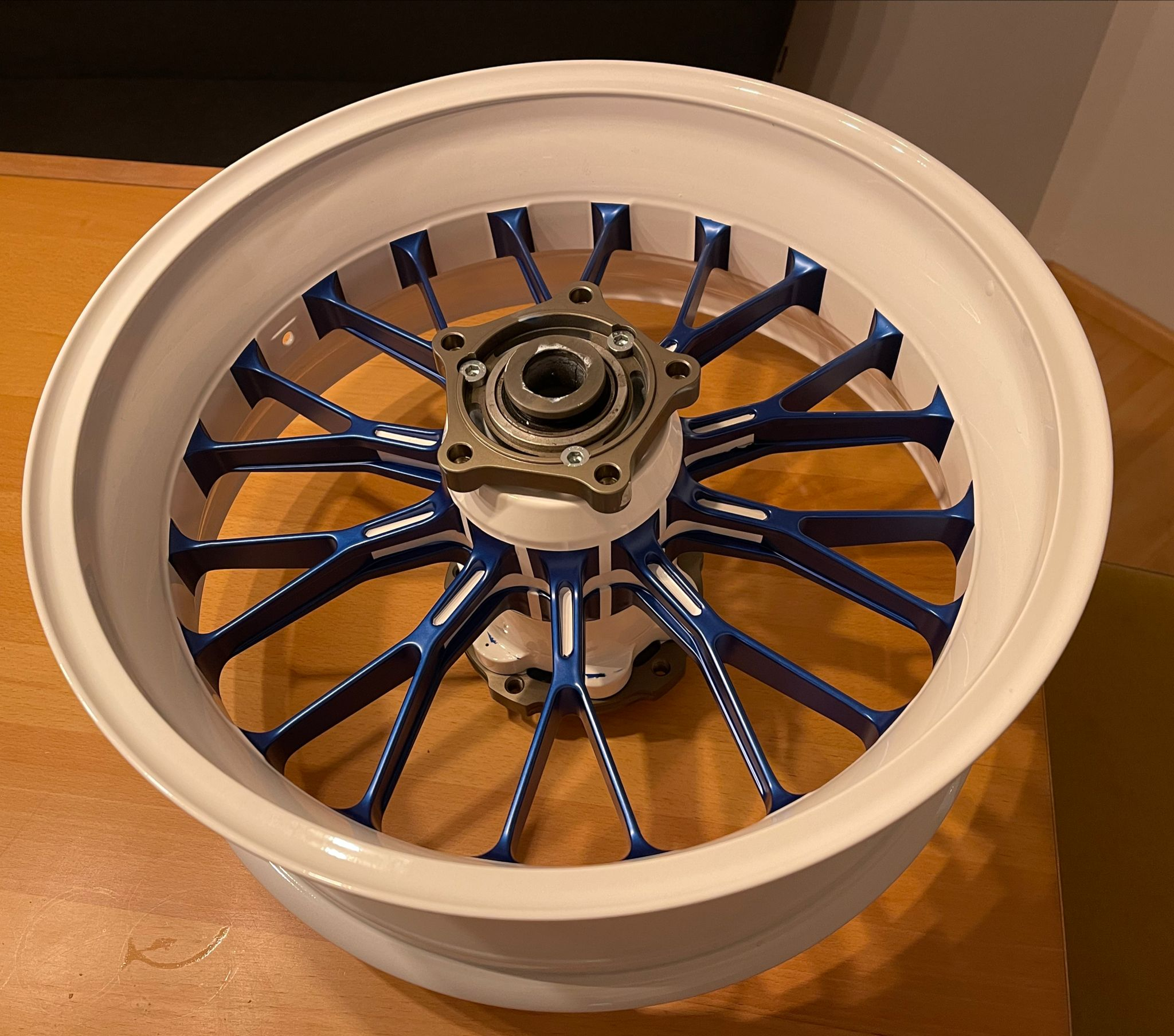 Sag mal: WAS für ein Rad ist das? Sieht eigentlich aus wie eine sehr breite Autofelge... Klar ist die elektrifizierte GSX jetzt kein Kurvenräuber mehr, aber gibt es für ein so breites Rad noch Motorradreifen, oder kommt da ein Autoreifen drauf?