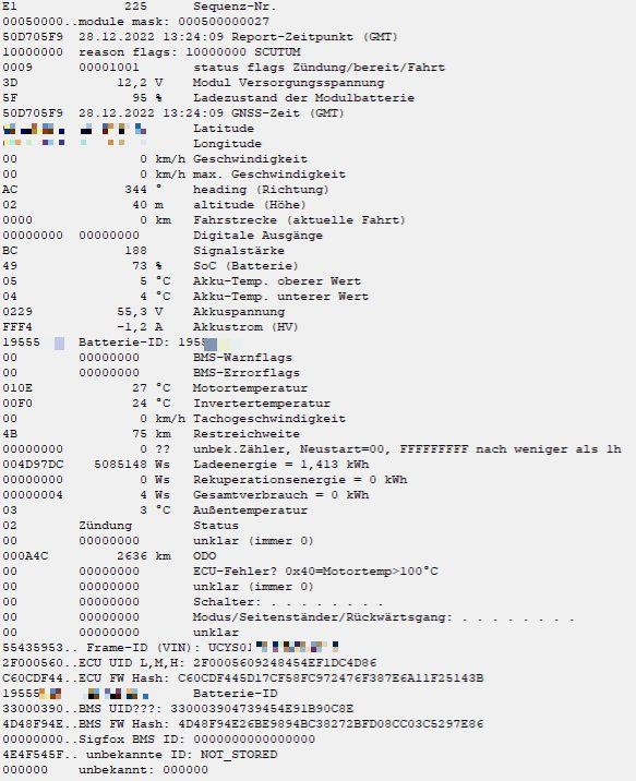 Nach meinen Aufzeichnungen ist bei meinem Roller das Bit 31 der reason flags mit dem Event MOTION belegt. Alles übrige kongruiert mit meinen Erkenntnissen. Nur der letzte gesendete Report hat zwei Reasons (SCUTUM und JNY STOP), das listet auch das Log klarschriftlich auf: