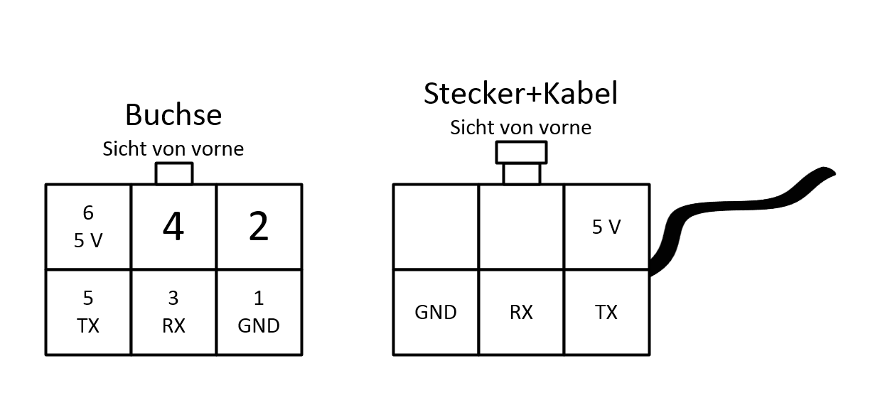 Du brauchst einen Adapter USB > seriell(TTl) z.b.: dann noch den Stecker(gibt es auch von anderen Herstellern): Und die Verdrahtung:unu-fan hat geschrieben: ↑Do 19. Jan 2023, 21:38Hi, eine Anleitung zum selber löten wäre super. Dann kann ich mal schauen, ob ich es hinbekommen würde.
