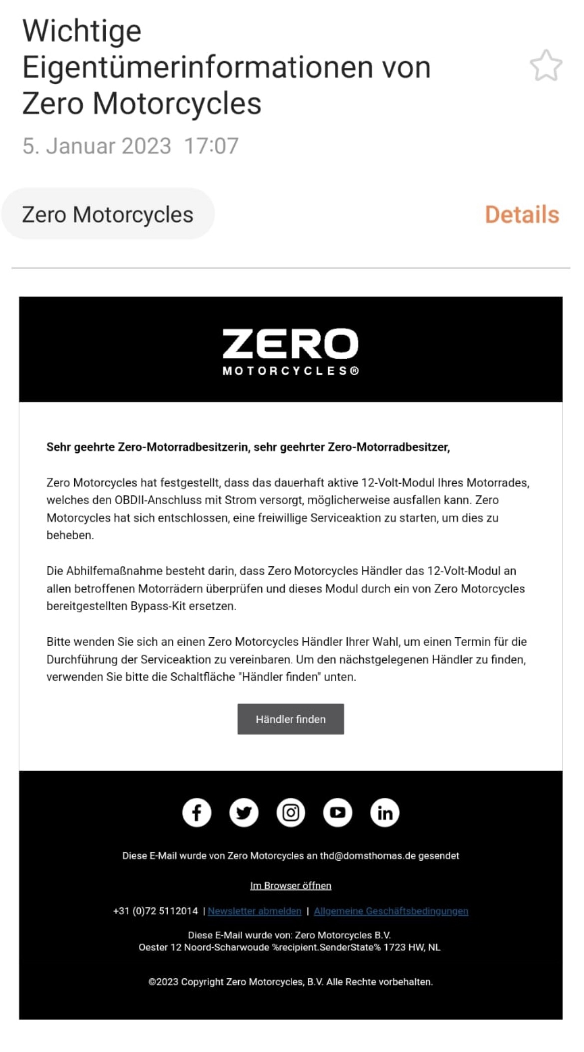 In der ERS Schönau Whatsapp gruppe hat einer eine e-mail von Zero bekommen (wieso hab ich die nicht ??): Das bestätigt also, dass ein 12 V Modul (watt??) den OBDII Anschluss dauerhaft mit Strom versorgt!