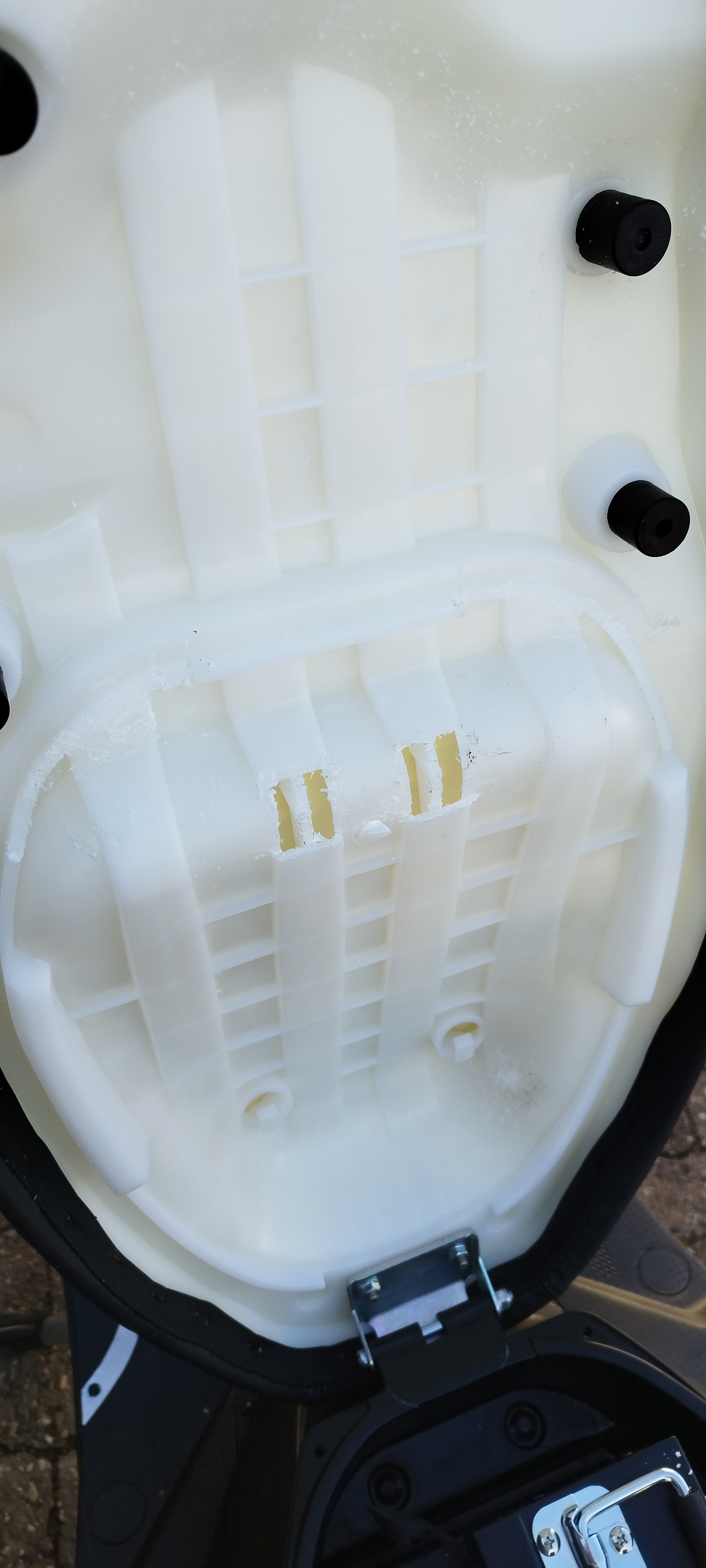 Zusätzlich habe ich mir ein stabiles und passendes Plastikteil gesucht und mit Sekundenkleber am Rand des Akkus festgeklebt. Tiefer als bis zu dieser Stütze kann der Sitz nun nicht mehr runter, und drückt somit nicht mehr auf den Flansch im Roller. Unter dem Sitz dämpft dann noch etwas Moosgummi, den Anschlag.