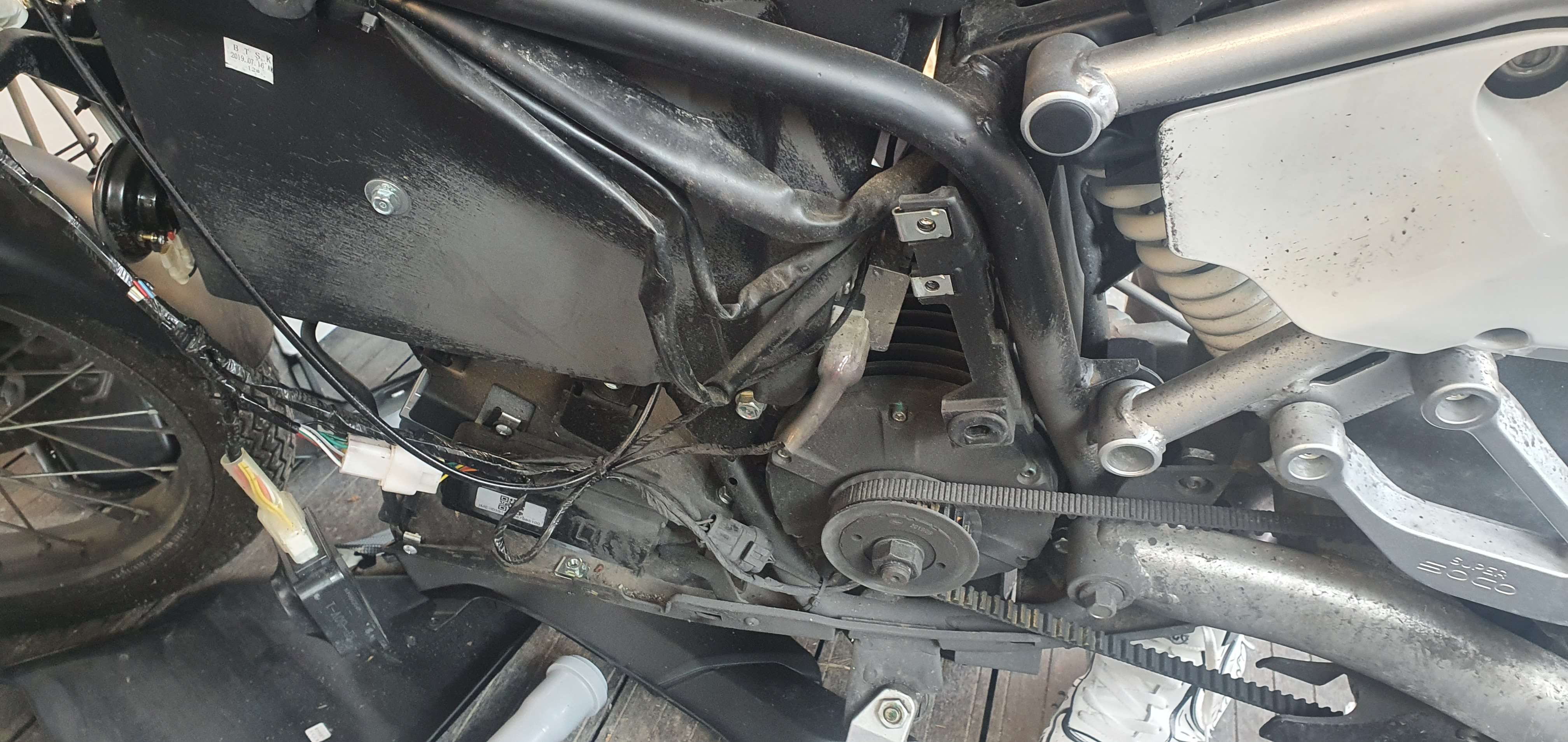 Offenbar das silberne Teil über dem Motor. Versorgung über den Kabelstrang, der an der Hupe vorbei geht.