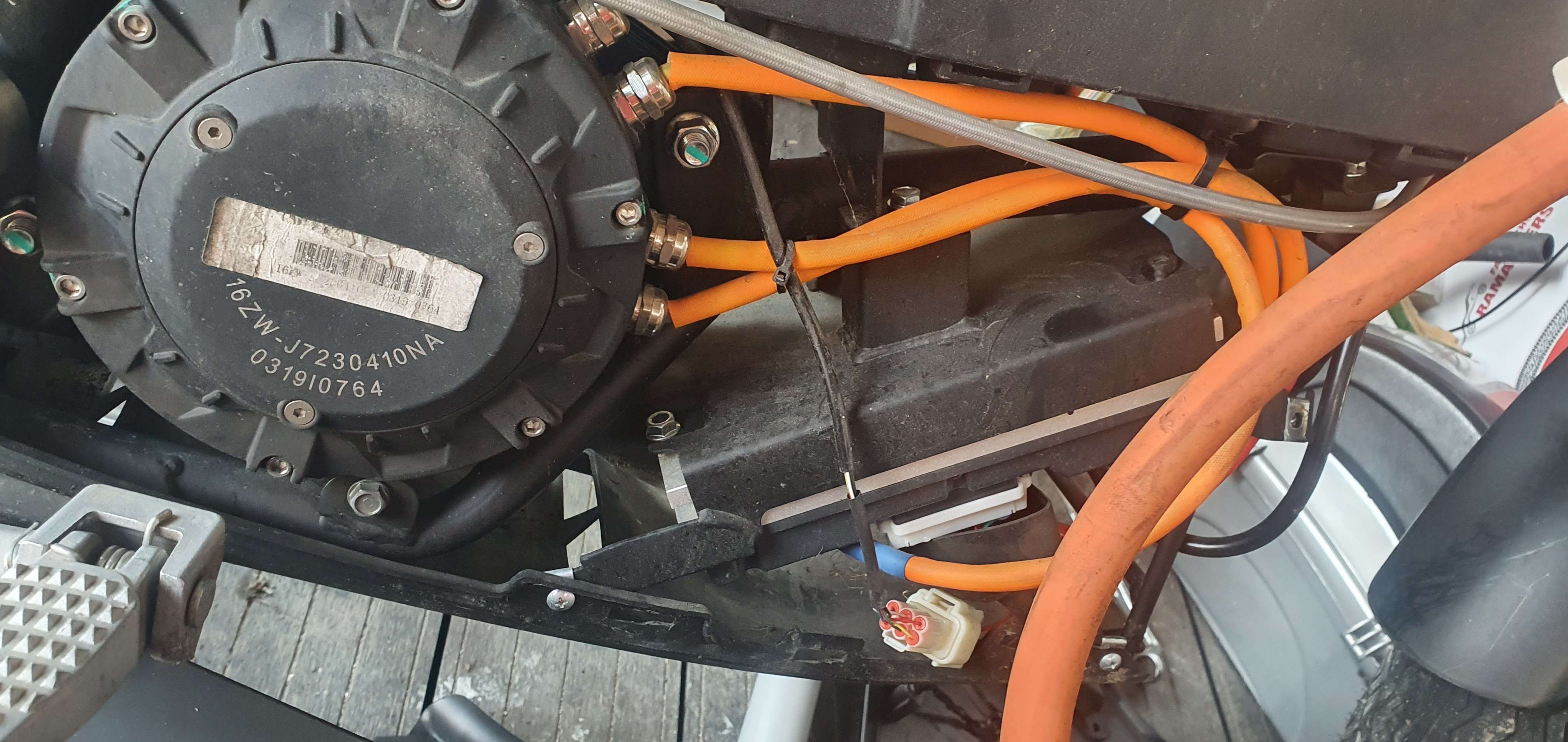 Offenbar das silberne Teil über dem Motor. Versorgung über den Kabelstrang, der an der Hupe vorbei geht.