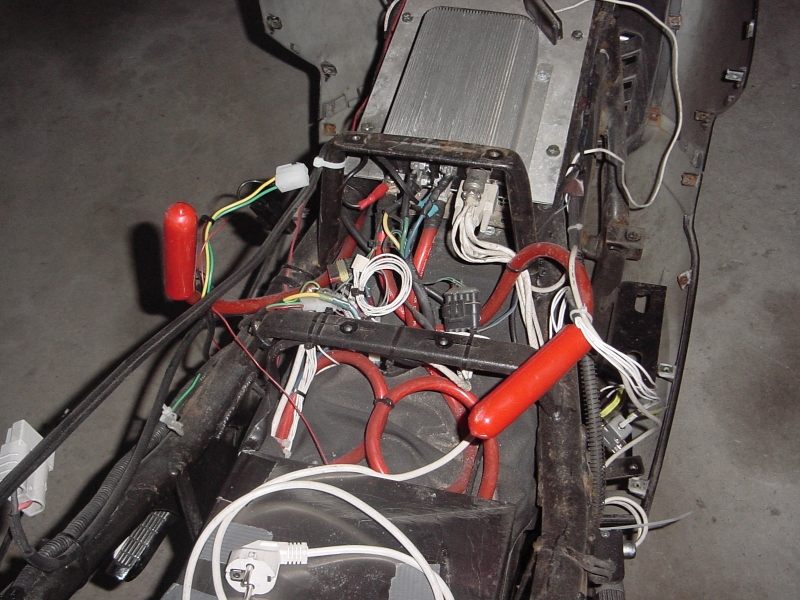 Erst mal wie sich Alfreds roten Monster-"Überzieher" als Schutz vor den blanken Hauptstrom-Kabelenden bewähren: Zum Vergleich das Bild vom letzten Mal mit dem Isolierband-Verhau (wie man's nicht unbedingt machen sollte...):