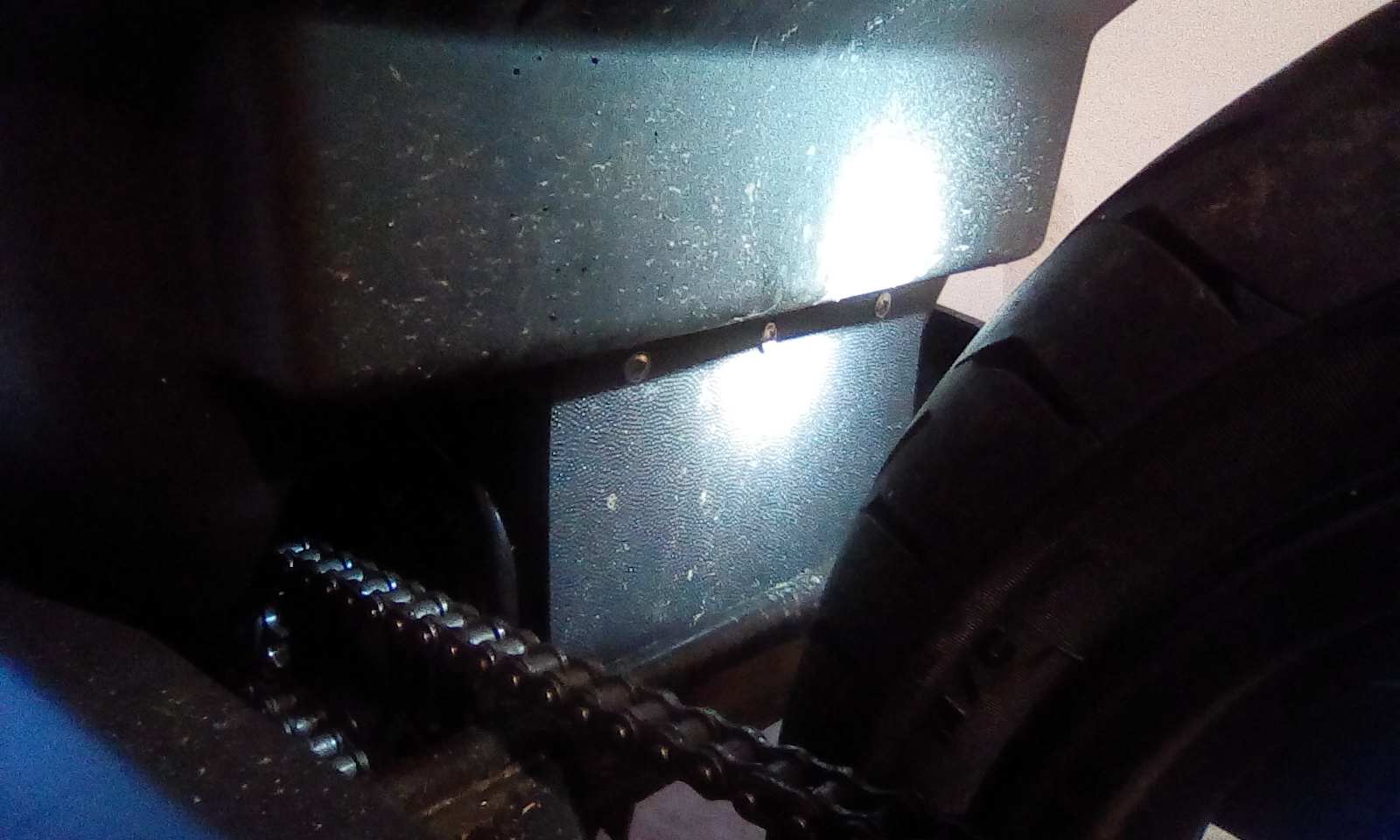 Abstand zwischen der einen Schwinge bis fast zur Kette gemessen, zugeschnitten und mit 3 kurzen Schrauben an der kleinen, ca. 2cm kurzen Lippe oberhalb des Motors befestigt (s.Fotos).