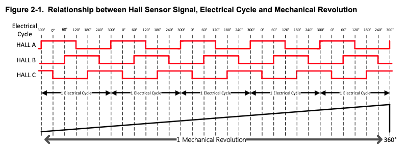 In vielen Erklärungen zu der Blockkommutation wird von einem einpoligen Motor ausgegangen. Dann bezieht sich ein "Hallzyklus" auf 360 Grad bzw. eine Rotorumdrehung. Man kann also die Position des Rotors in einem 60 Grad Raster messen bzw. feststellen.